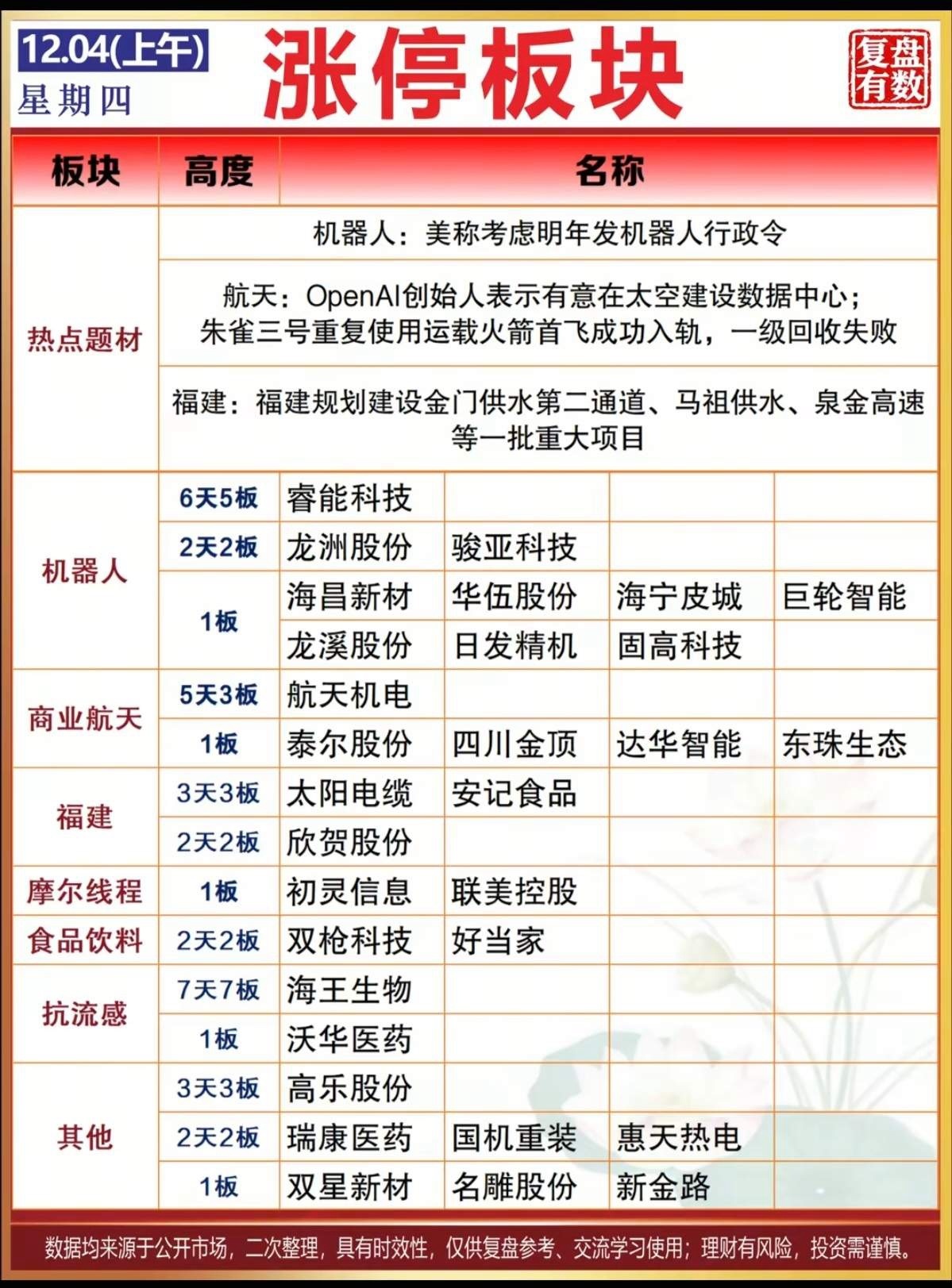 12.4周四 涨停板股票:题材+高度!1.机器人 10股涨停2.商业航天 5股涨停3.福建 3股涨停4.摩尔线程 2股涨停5.抗流感 2股涨停