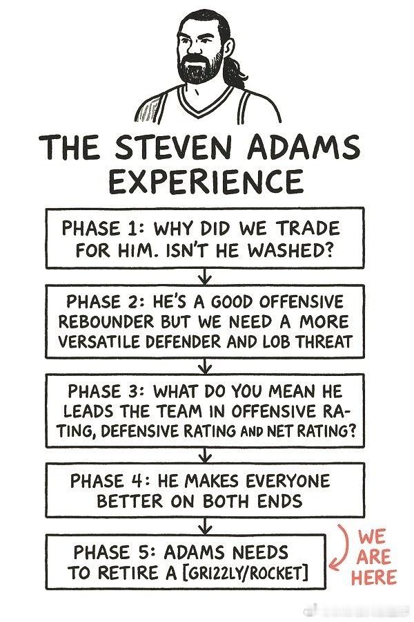美国亚当斯博主晒出一张趣图📊史蒂文·亚当斯的五阶段体验:▪️第一阶段:我们为什么要交易得到他?他不是已经过气了吗?▪️第二阶段:他是个不错的进攻篮板手,但我们需要一个更全面的防守者和空接威胁。▪️第三阶段:你什么意思?他带队在进攻效率、防守效率和净效率上都排名第一?▪️第四阶段:他在攻防两端都让全队变得更好。▪️第五阶段:亚当斯需要以火箭球员身份退役(我们在此阶段)。火箭战胜国王国王vs火箭休斯顿火箭