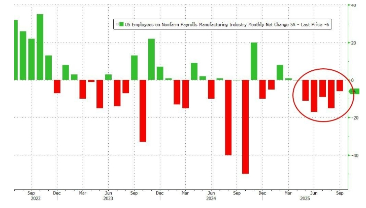 美国制造业就业不升反降。全球都有类似现象,货币系统不断扩大也创造不了想要的就业,只有酒店旅游业明显受益美国劳工统计局上周就业报告,非农就业人数增加了11.9万人,但制造业岗位减少了6000个。特朗普4月大搞关税战,一个目的是要激活制造业,但工厂岗位流失总数已达5.9万个,连续六个月下降,如图。经济评论员说,美国自疫情以来首次失去蓝领工作。制造业工作岗位快速流失,同步的是建筑和交通增长几乎趋于零。此前白领工作已经冻结很久了,大公司裁员消息一波接一波,已经有论文说明重要原因是AI。但市场上总觉得蓝领和工厂工作不难找,这被视为找工作的安全港,为焦虑不安的办公室职员提供退路。但制造业岗位也减少了,退路也开始减少。招聘专家劳拉·乌尔里希在《财富》杂志评论说:“制造业的软弱令人印象深刻,因为理论上,关税是为了保护国内制造业,从而增加国内制造业就业。”专家解释说,这是因为关税带来不确定性,工厂反而谨慎了。受关税影响的公司,通过降低劳动力成本来维持利润率。乌尔里希指出,只有医疗和休闲酒店业持续带来工作,包括蓝领;几乎所有行业就业都不景气,关税让制造业工作成为另一个脆弱性来源。经济学家说,中间品价格上升,关税提高了投入和生产成本,从而抑制了招聘。这是早有预言的,在美国开工厂的成本高得吓人,交关税进口还是最简单的办法。美国就业的事,在中国也有类似现象。白领工作不景气,人们认为蓝领工作是退路,但是快递、外卖、网约车也有饱和现象。考公非常火爆,超过了考研。中美制造业工作共同点是,工厂其实非常希望招收高技术员工,但招不到。如福特有5000个机械师职位空缺,其中一些薪资高达12万美元,但招不到人,没有合格的人。德勤在2024年对200多家美国制造企业进行的调查显示,超过65%的企业表示招聘和留住员工是他们面临的最大挑战。中国制造业公司也在市场上寻找人才,但社会仍然缺乏意识,不愿意学习实用的制造业技术。在全球来说,为了应对经济危机、维持运营,全球央行都大规模扩张货币体系,通过大幅增发货币或增加贷款。但无论是经济增长和创造就业,成果都不算好。明显的大影响是股票、黄金、加密货币估值大幅上升,但这些是资本市场的事,市场就业仍然不好。本质上来说,普通人的技能相比机器,日益显得质次价高,无论是蓝领还是白领。东南亚与南亚的工厂,即使工人工资比中国低得多,也无法抵挡中国工厂数量越来越多效率越来越高的机器。而大量白领工作的真相是可有可无,公司因为不景气、保利润之类的理由裁员的时候,裁员的空间很大。整个人类社会,生产力不断在进步,以中国为中心。但社会整体上并没有感到放松,大面积对自身的劳动价值产生了焦虑,对未来没有信心的人越来越多。只有部分财富与社会地位足够安全的人,支撑了畅旺的酒店旅游业,东亚与欧美的旅游需求增长都很不错。
