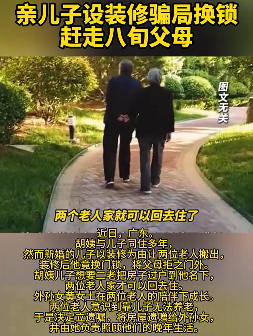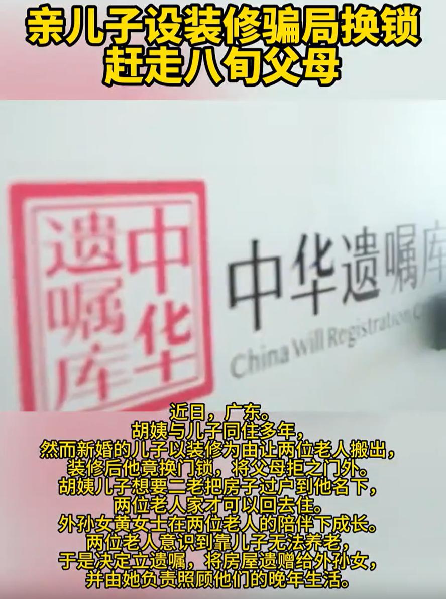 “太寒心了!”广东汕头,两位老人住在自己的房子里,儿子说要结婚装修新房,就让老两口先搬出去住一阵,不料,等两位老人再回来时,却发现儿子已经换了锁,并要求两人把房子过户到自己的名下,两人一生气,直接立了个遗嘱,这房子以后都跟儿子无关了 胡姨和老伴,如今都80多岁了,本来过得踏实。虽然年纪大了,腿脚慢了点,但住在自己熟悉的房子里,人心是安稳的。家里有儿子在同住,起码遇到摔一跤、生个小病,也有人能搭把手 后来儿子说要结婚,说要装修,说父母先搬出去一阵。老两口也没多想,觉得孩子要成家,做父母的总要支持一下。等装修完打算回家,却发现门锁已经换了。那一刻才意识到事情变味了 儿子把房子当成筹码,把父母当成条件。只有把房子过户,他才愿意让父母回自己家门口。这种做法不只是伤心,而是把一对老人几十年的辛苦,一把锁就给抹掉了 他们年轻的时候攒钱买房,把孩子拉扯大,从没有想过有一天,会被堵在自己家的门外 指望着儿子养老,如今看来是靠不住了。老两口一商量,做了一个决定:去立遗嘱。他们决定,这套房子以后不再留给儿子,而是留给从小就和他们亲近、由他们带大的外孙女。条件也很简单:由外孙女来负责他们今后的养老照顾 说实话,虽然不清楚一家人之前是否有过矛盾,但儿子的这种做法,确实让人不敢恭维 一般来说,财产传给子女是顺理成章的,也隐含着“以房养老”的期待。但当这份期待建立在子女的孝心上,而孝心又可能因为各种现实因素变质时,老人就变得非常被动 胡姨儿子的做法,本质上是将亲情物质化,用居住权要挟产权,把老人置于孤立无援的境地 老两口选择立遗嘱将房产留给外孙女,并非一时赌气,而是一种清醒的“权益再分配”。他们用法律工具,将未来的照料责任与财产继承明确挂钩,为自己换来了更可靠的保障 这其实提醒了很多老年人:爱可以是无条件的,但财产安排需要理性条件。 事先通过遗嘱、意定监护等法律方式明确权利义务,不是不信任,而是对所有人负责,也能避免日后不必要的纠纷