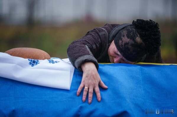 冬雨裹着雾,乌克兰的田野里,蓝黄旗帜覆在棺木上——那是她儿子的栖身之所。 她枯瘦的手抚过布料,像从前抚过他幼时的发。头巾掩不住颤抖的肩,泪砸在旗面的蓝里,洇开比硝烟更重的寒。风里只有呜咽,是母亲把“再见”咬碎在喉间。(12.4) 记波克罗夫斯克战役与俄军交战阵亡士兵