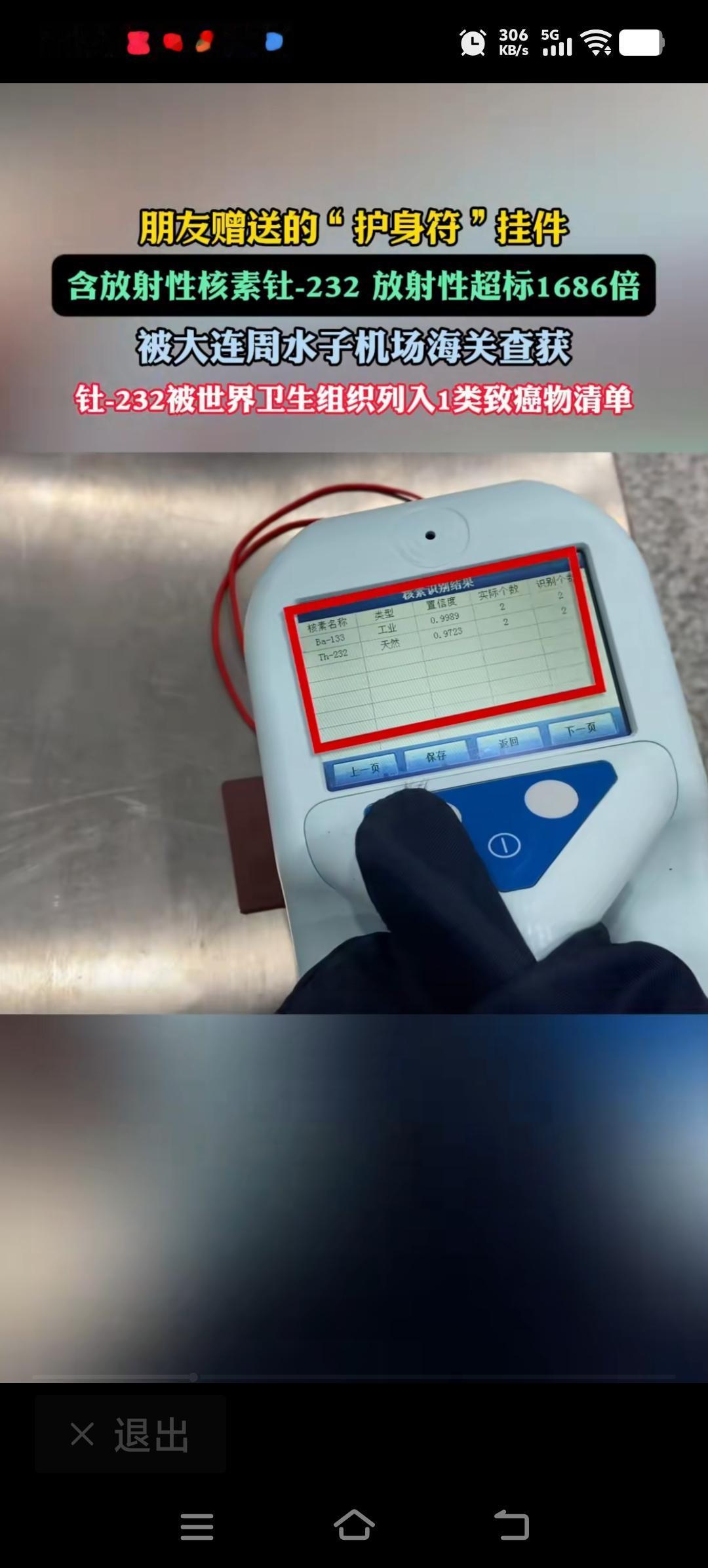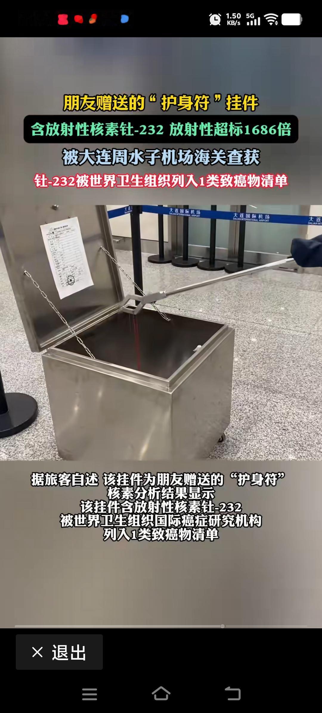 好悬!护身符差一点就变身夺命符了。 世上哪有什么护身符,只要自己不作恶,多行善积德,就是对自己最好的保护。人行走在世间,千万不要把自己的安全寄希望于外物。 最近,在大连周水子机场,海关人员检测出一位乘客胸前所佩戴的一块上面刻有奇特符号的护身符,含放射性元素,放射超标1686倍。 据旅客自己说,这是一位朋友赠送给自己的“护身符”,哪里会想到竟然是放射性元素釷-232,并且这种元素被世界卫生组织列入1类致癌清单。 本来觉得一块护身符,会给自己带来生活和生命的保障,没想到确是个夺命牌。辛亏被海关人员给检测出来了,如果没被发现,不知道自己会被 害成什么样子。等到自己被害死了,可能还在帮人数钱呢! 如果,发现不了这玩意含有放射元素,不光会害自己,还会害与自己相亲近的人。想想都后背发凉! 有可能朋友也不知情,都是被人忽悠了。但是那个偷偷数钱的人,这时肯定在偷笑呢! 真希望,大家都擦亮眼睛,对来历不明的东西千万不要戴身上。 图片来自网络,侵删致歉。