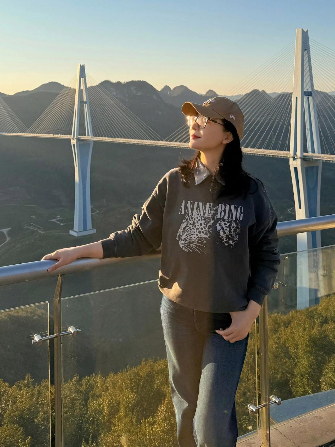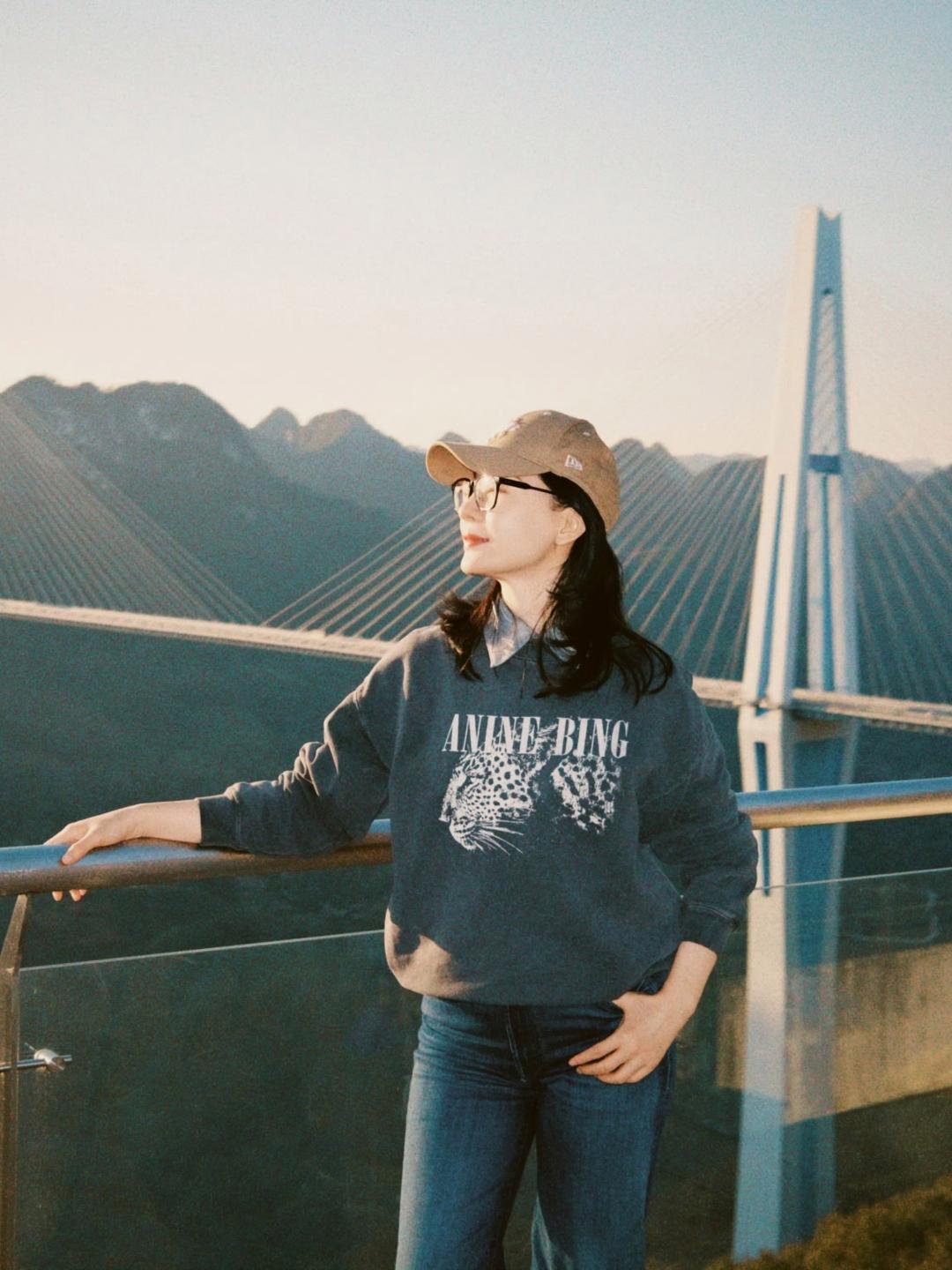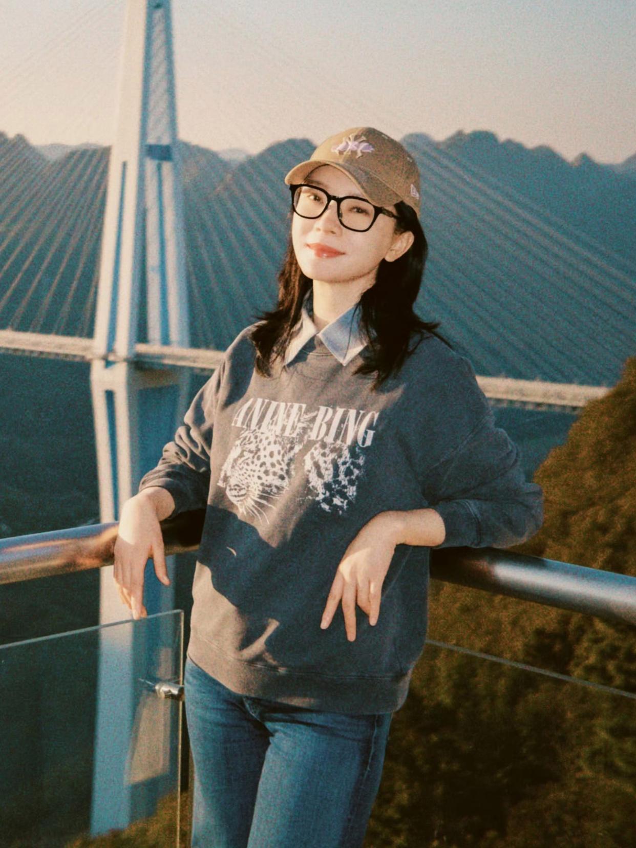 陈数这组出游照也太有氛围了吧! 戴着棒球帽+黑框眼镜,穿一件休闲卫衣配牛仔裤,随性又舒服;站在“天空之桥”观景台,身后是青山与巨型大桥的壮阔背景,落日余晖裹着她的笑意,松弛感直接拉满~