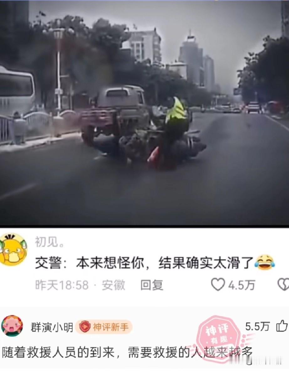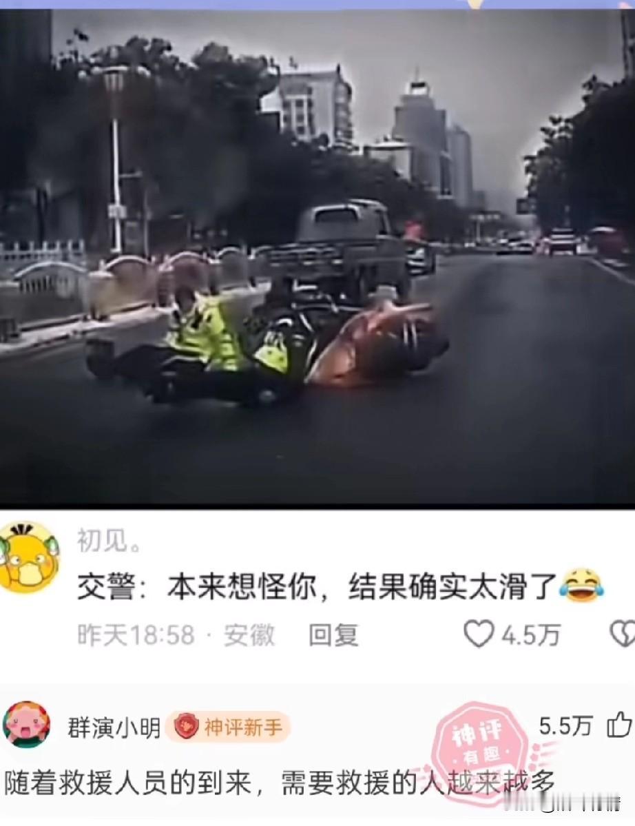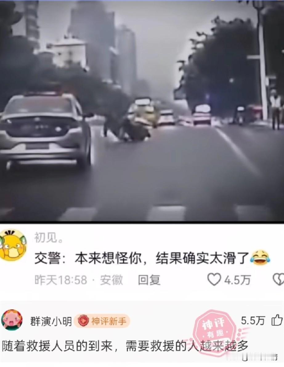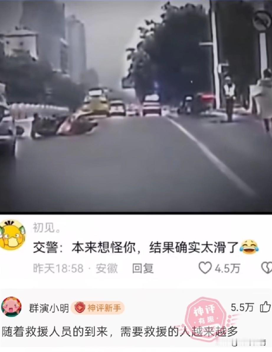 马路上一男子骑着电动车, 突然摔倒了, 旁边站着三个交警目睹了这一切, 后面的轿车也吓了一跳, 由于赶紧打了方向, 没有撞上跌倒的电动车男子, 旁边的三位交警赶紧上去, 想要看看男子有没有事, 三位交警刚走过去, 结果那块路面非常的滑, 三位交警也麻溜的摔倒了, 他们懵逼的表情太逗了, 本来还想怪骑电动车的男子, 结果发现真的是路太滑了, 网友表示随着救援的人员大量赶到, 需要救援的人越来越多, 大家对于骑车男子的遭遇怎么看? 交通事故 两轮电动车事故 骑电车摔倒 车摔了一跤 电动车横过马路