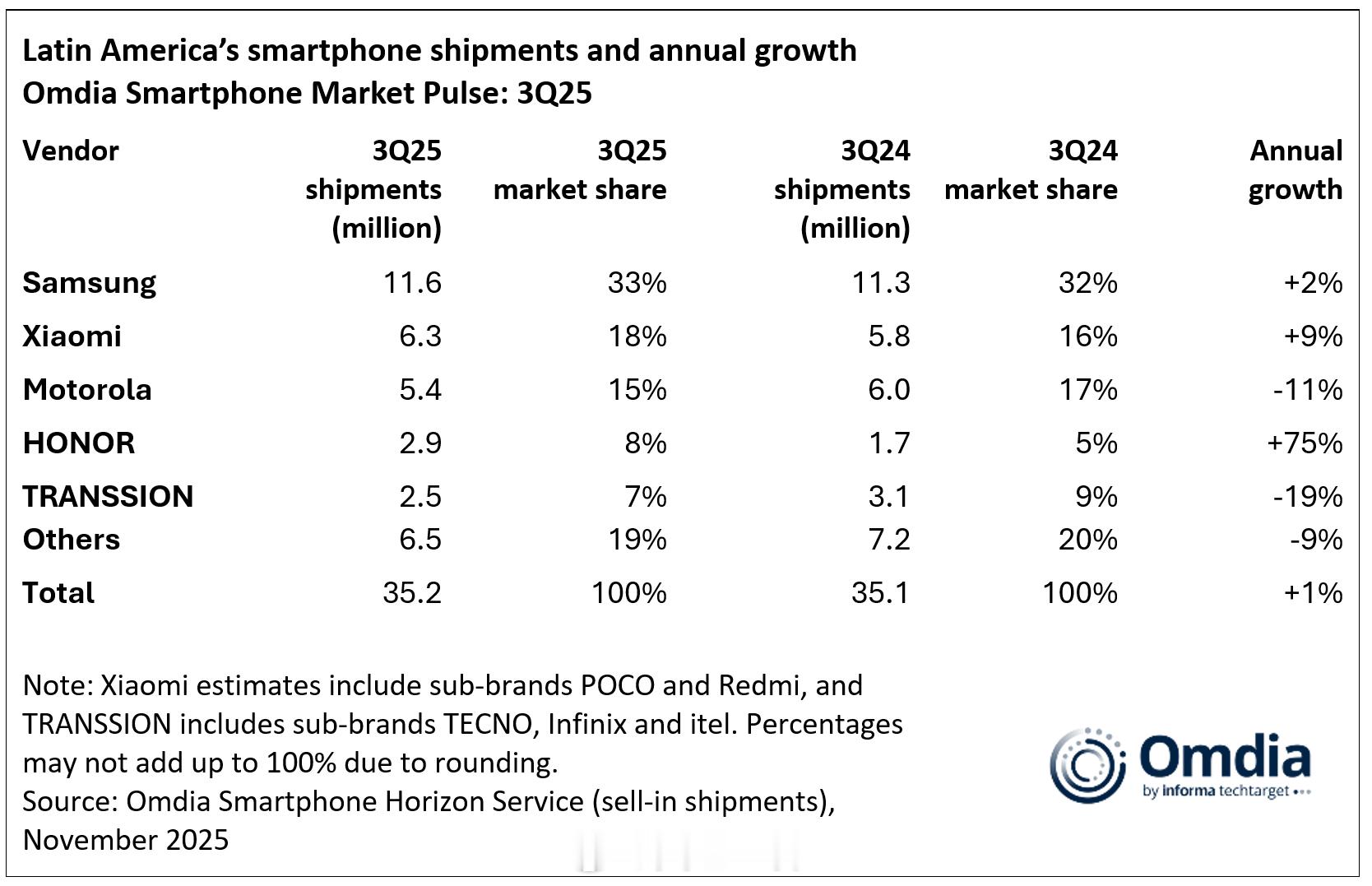 Omdia发拉美市场Q3报告,小米国产第一1、Q3拉美市场整体出货量达到3520万台,同比增长1%。是自2015Q4以来出货量最高的一季度;2、排名:三星、小米、摩托罗拉、荣耀、传音;3、前五品牌三星、小米、荣耀同比在增,其中荣耀增长速度最快,达到75%;摩托罗拉与传音同比在跌。特别是摩托罗拉已经是连续六个季度同比下跌了。PS:虽然前五品牌有四个国产,但他们与三星真不在一个档次之上。毕竟只有三星出货量是以千万来计算的。