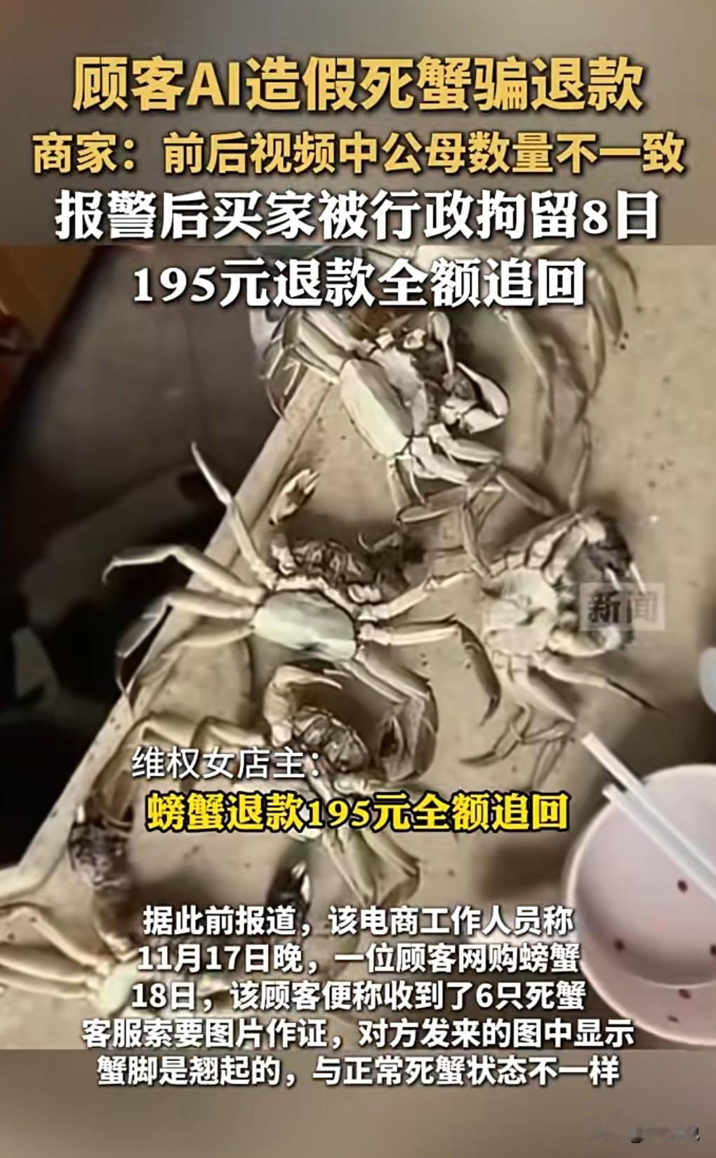 想不到有人竟然利用AI来违法犯罪。 近日,有商家吐槽,买家AI合成“死蟹”骗退款。 这真是太恶劣了,这真是人性的扭曲啊。 买家被拘留8日,这真是大快人心啊。 就是要好好惩罚这些道德败坏之人。 AI实在是太强大了,网上充斥着大量的AI视频,让人难辨真假。 用Ai视频来虚假造谣博流量实在是非常的可恶。