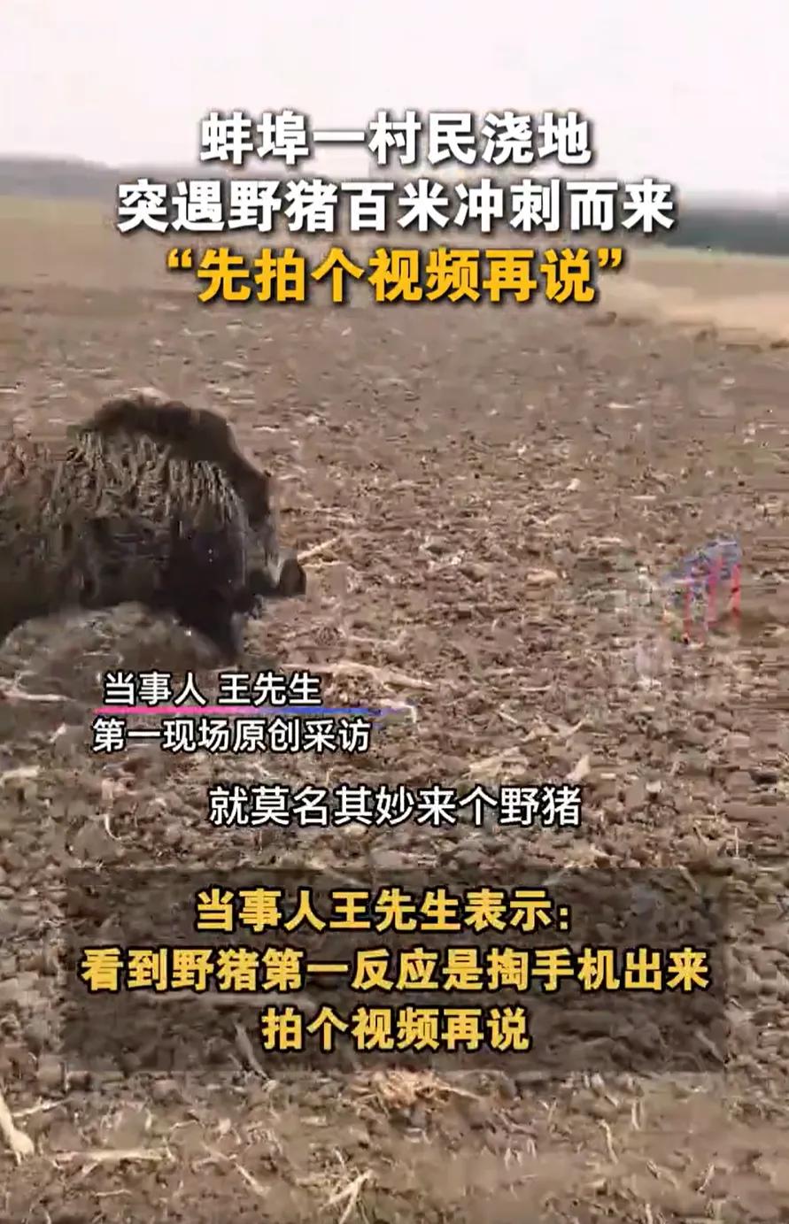 这心也太大了!安徽蚌埠,一男子在村里浇地,远远处突然有一个东西奔着自己跑过来,仔细一看竟然是一头野猪,可男子不但没跑,反而拿出手机拍视频。网友:这是真淡定啊! 村民老王正在地里浇冬小麦,眼角余光瞥见远处玉米地窜出个黑影,直奔自己而来。 等看清是头半大野猪时,换旁人早吓得魂飞魄散,他却反手掏出手机,稳稳架起拍摄。 视频里野猪四蹄翻飞,鬃毛炸起,气势汹汹离他只剩几步远,老王才慢悠悠往后退了两米。 没曾想野猪突然拐了个弯,一头扎进旁边的树林,总算有惊无险。 这段视频传到网上后,评论区瞬间炸了锅,网友们直呼“心比天大”“拿命拍段子”。 可别被“野猪”里的“猪”字骗了,它跟家里圈养的肥猪,压根是两码事。 世人多有误解,以为它憨态可掬,实则性情暴戾;以为它笨重迟缓,实则奔袭速度堪比电动车。 这东西的冲劲堪称“陆地小坦克”,一旦发起狠来,一头就能撞翻成年人,地里的玉米秆被它拱一下,便成片倒伏。 更难缠的是它的性子,轴得很。平日里不惹它便相安无事,可若是遇上繁殖期、带着幼崽,或是被惊扰,便会不管不顾地猛撞。 再加上那对磨得锃亮的獠牙,别说皮肉之躯,就连铁皮水桶都能被它拱得坑坑洼洼,农村里不少人都吃过它的亏。 老王这一回能平安脱身,全靠野猪只是路过,没把他当成目标。 野生动物向来谨慎,不主动挑衅便不会主动攻击,但侥幸一次不代表次次幸运。 遇事别只顾着拍视频博眼球,敬畏自然、保护自己,才是最该放在心上的事。