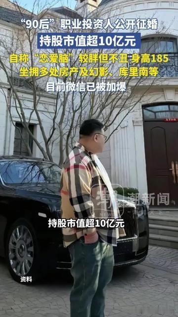 这反差比抓涨停板还让人好奇! 90后管着10亿市值、开库里南的投资人,征婚第一句居然说“我是恋爱脑”? 持股市值超10亿,有幻影、库里南,身高185,较胖但不丑,现在微信都被加爆了。 有人说“恋爱脑是噱头,冲钱来的人肯定多”;也有人说“有钱人也想找不用算的爱情,挺真实的”。 我倒觉得这征婚有点可爱,天天算交易风险、盯盘到凌晨的人,说不定就想找个能让他放下算盘的人。毕竟啊,谁不想被放在第一位? 你们信有钱人会有恋爱脑吗?要是你,会因为恋爱脑选他不?