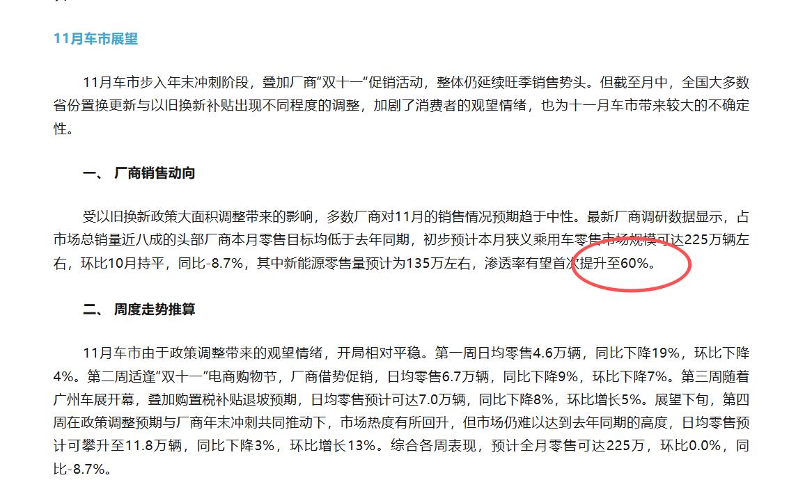 电车销量是油车的1.5倍!不可思议,难以想象,乘用车联合会预估11月狭义乘用车零售市场规模可达225万辆左右,环比10月持平,同比-8.7%,其中新能源零售量预计为135万左右,渗透率有望首次提升至60%。【来自懂车帝车友圈】
