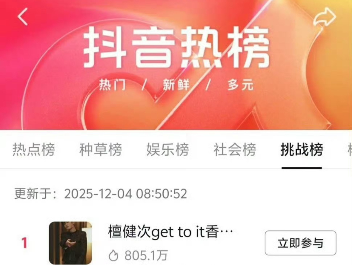 檀健次新歌登上抖娱乐榜挑战榜双榜top1☝🏻