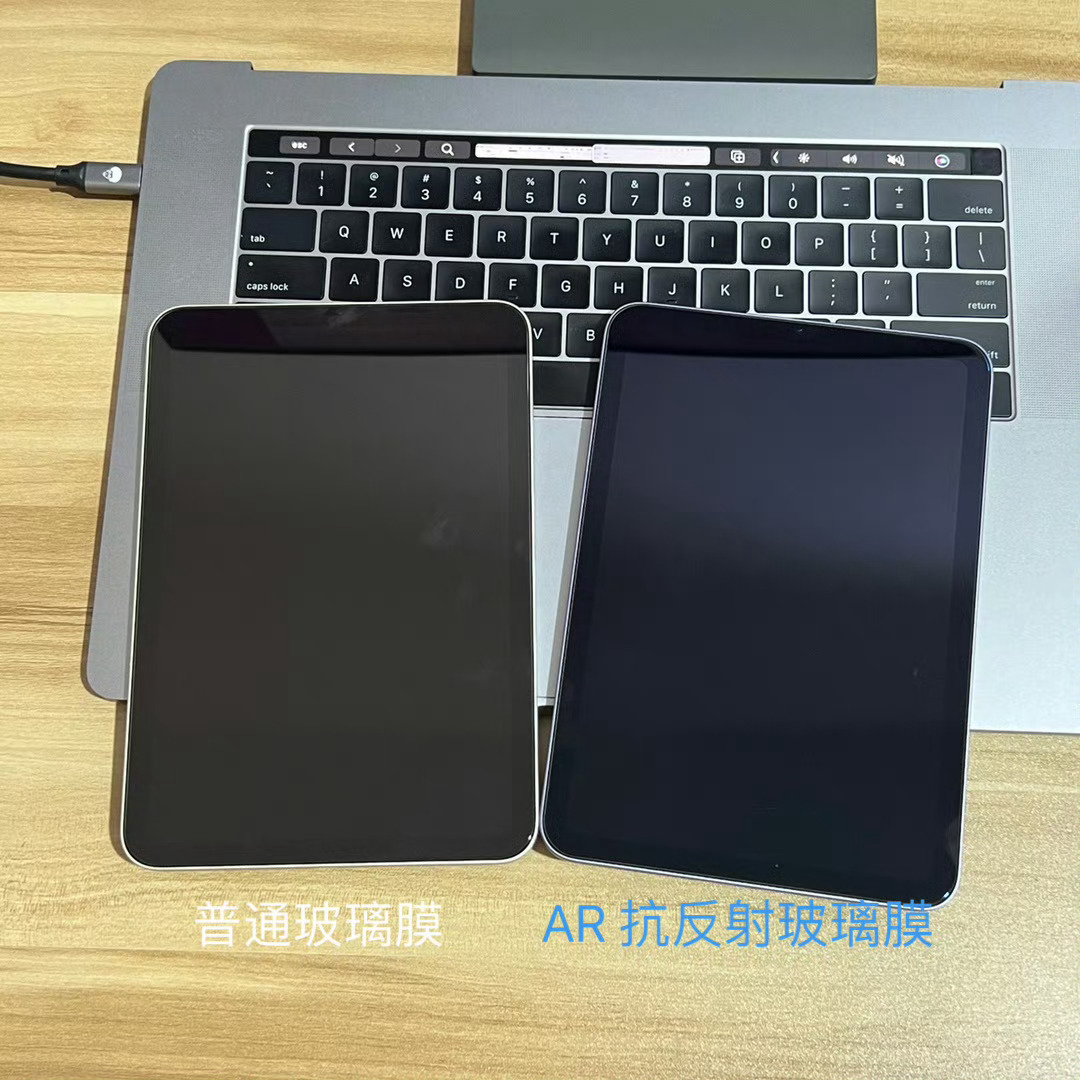 iPad mini7/6 AR 增透玻璃膜,降低反光反射后,屏幕内容显示也是会清晰不少。这款贴上 AR 膜,虽然相比裸机抗反射效果会弱一点点,但相比高清款玻璃膜,还是能带来一定的抗反射,也可以给屏幕起到一定的防护作用