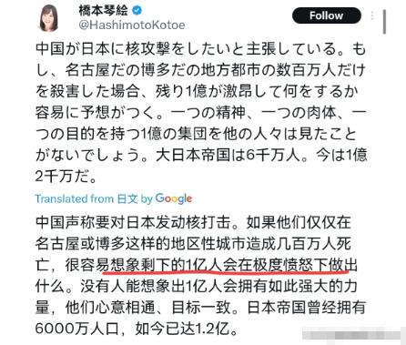 日本极右翼分子桥本琴绘表示,有人声称中国想对日本发动核攻击。如果只杀害名古屋、博多等地的地方城市数百万人,不难预想剩下的1亿人会愤怒地做出什么事。恐怕其他人从未见过拥有同一精神、同一肉体、同一目标的1亿人的集团吧!大日本帝国当年有6000万人,如今已经有1.2亿人了。 有些人的脑袋似乎还停留在上个世纪,最近日本极右翼圈子里冒出个叫桥本琴绘的人物,她的言论简直让人感觉穿越回了二战前夕,这位不仅臆想“中国要对日本发动核打击”,还搬弄着所谓的数据:假如名古屋、博多这些地方遭难,几百万人伤亡,那剩下的可是“同气连枝”的一亿多人,她声称这一亿两千万有着“同一精神、同一肉体、同一目标”,还拿大日本帝国时期的六千万人口做对比,仿佛在暗示如今的人口翻倍,爆发出来的“愤怒”也会翻倍。 这番“豪言壮语”,是不是听着极其耳熟?当年那些疯狂鼓吹“一亿玉碎”,号召所有国民拿竹枪去对抗盟军坦克的军国主义者,用的不就是这一套说辞吗?这完全是在为那个罪孽深重的旧帝国招魂。 且不说这种把平民绑上战车的逻辑有多冷血,单看历史事实,这就已经是一个巨大的讽刺,当年老美两颗原子弹扔下去,那些叫嚣着要碎得轰轰烈烈的口号实现了吗?现实是日本政府光速滑跪投降,“一亿人”并没有变成复仇的丧尸,这个所谓的“精神集团”在绝对的实力差距面前,其实脆弱不堪。 更荒谬的是,桥本琴绘这帮人对于现代国际规则和中国的底线简直缺乏最基本的认知,中国早就承诺过不首先使用核武器,更不会对无核国家动手,这并不是什么秘密,极右翼分子不仅不吸取作为唯一核爆受害国的历史教训,反而试图通过渲染恐惧来倒打一耙。 他们的如意算盘其实很清楚,就是想借此制造恐慌,甚至为日本突破和平宪法、打破“非核三原则”寻找借口,但他们恰恰忘了,一旦日本真的试图染指毁灭性武器,那性质就全变了,到时候日本就不再是无辜的“非核国家”,而会立刻成为我们合法的打击目标。 至于这一亿两千万人的“愤怒”能不能转化为战斗力,现在的网友们早就给出了无情的嘲讽,都21世纪了,还在用“人海战术”那一套来思考战争,简直是天大的笑话,现在的战争打的是什么?是体系支撑,是机器狼、机器人的钢铁洪流,真要动起手来,先把关键军事设施一瘫痪,不管是六千万还是一亿两千万,在现代化的高科技压制下,剩下的选项只有缴枪不杀。 解放军发言人对此早就把话说透了:如果有人想以此作为筹码,那么整个日本都可能成为战场。这甚至不需要特别去针对某几个城市,中国完全具备全域覆盖的能力。 所以这帮极右翼分子越是上蹿下跳,越是暴露了他们骨子里那种“军国主义亡灵”的顽固不化,他们在恐惧中臆想被害,又试图把民众绑架到战车上,企图阻挠中国的国家统一进程,但这完全是打错了算,如果真的敢铤而走险,结局绝对不会是他们幻想中的“全民反击”,而只会是一场彻彻底底的、比当年更决绝的“二次清算”,对于这种逆时代潮流而动的行为,还是趁早歇歇吧。