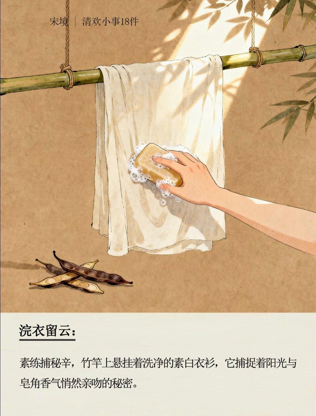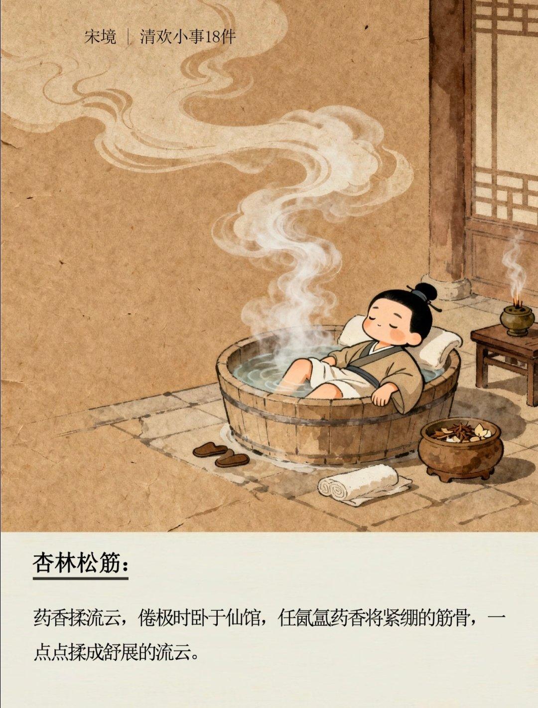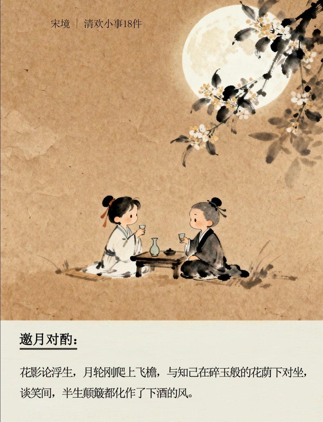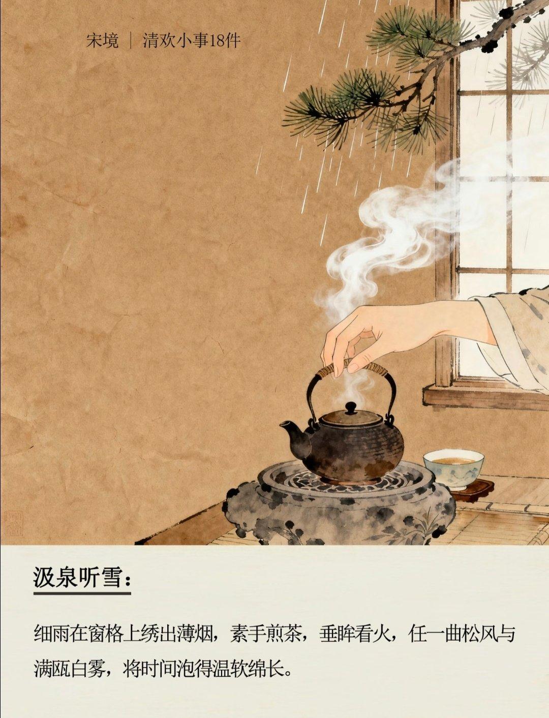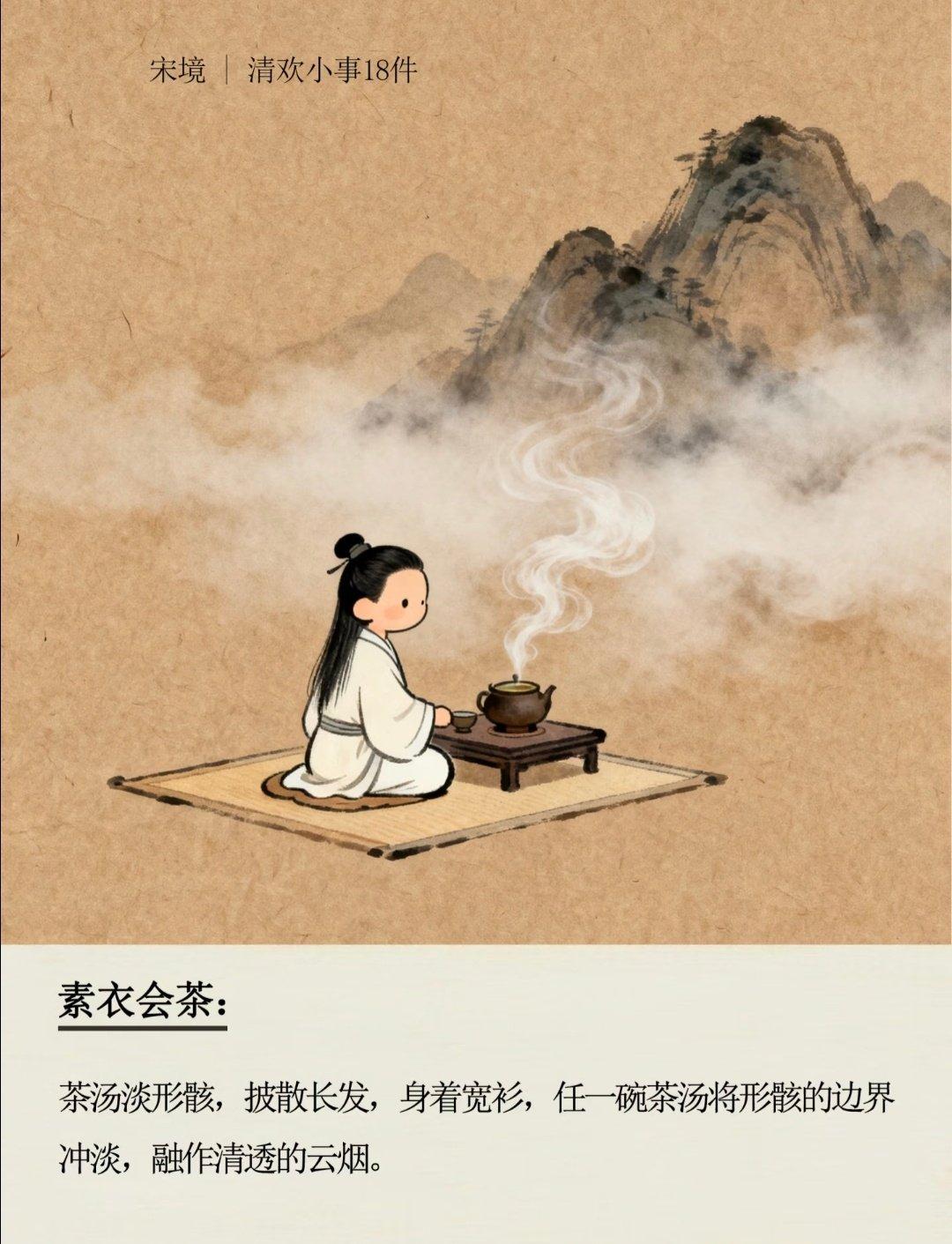 “宋境”制作的“17件治愈的清欢小事” 1. 焚香入静:取一枝沉香置于素炉,看青烟袅袅,闻香气幽远,在香烟缭绕中让浮躁退散,调和心气,安顿精神。 2. 点茶品韵:将茶饼碾粉,沸汤调膏,用茶筅击拂出绵密汤花,在点茶过程中感受心境的沉静,品味盏中风月。 3. 挂画寄志:根据季节更换画作,如春天挂《早春图》,夏日悬《荷塘消夏》,通过赏画心游物外,寄寓情志。 4. 插花赏趣:选一枝寒梅或一茎清荷,置于古瓶素瓷间,欣赏花枝俯仰、叶片向背的自然之态,于虚处藏情,感受生活爱意。 5. 清溪泛舟:在悠悠清溪中泛舟,观赏两岸风景,如苏子与友人游赤壁般畅所欲言,让心灵在自然中栖息。 6. 竹窗夜话:微雨之时,与挚友在竹窗下谈笑,让思绪在雨幕中飘荡,享受静谧而深刻的交流。 7. 临溪濯足:暑热之际,赤脚走入清凉溪水,感受透心凉意,在与自然的互动中获得生理和精神的放松。 8. 雨后看山:雨后登上高楼,观赏脱去尘埃、色彩斑斓的山岳,仿佛置身仙境,领略自然之美。 9. 柳堤闲行:在清风柳影笼罩下,于堤畔悠然散步,让时间仿佛停滞,感受万物的轻灵。 10. 花坞品茶:与好友齐聚花坞,品茶赏花,体会恬淡宁静,让生活渗透着文化香气与愉悦。 11. 山寺闻钟:聆听隔江山寺传来的悠悠钟声,伴随着江水流动,让心灵在钟声中得以平静。 12. 月下听箫:月光下,倾听东邻悠扬的箫声,看竹影摇曳,享受这难得的安静时光。 13. 晨兴品茗:清晨起来,品尝一瓯茗茶,伴着茶香阅读一卷书,为日常忙碌增添几分文化氛围。 14. 午间小憩:午后倦意袭来时,躺在藤枕上小憩片刻,在简单中感受幸福,治愈疲惫。 15. 汲泉烹茶:有好友光顾时,汲取泉水烹煮清茶,将情谊浸泡其中,感受情谊的酽厚温暖。 16. 抚琴会友:弹奏古琴,与知音之人分享音韵,在共鸣与理解中体会人生难得的快乐时光。 17. 观鸟听语:看鸟儿自由飞翔,聆听其悦耳鸣声,感受自然的灵动,让心灵更为欢跃。