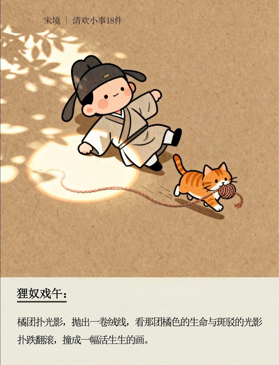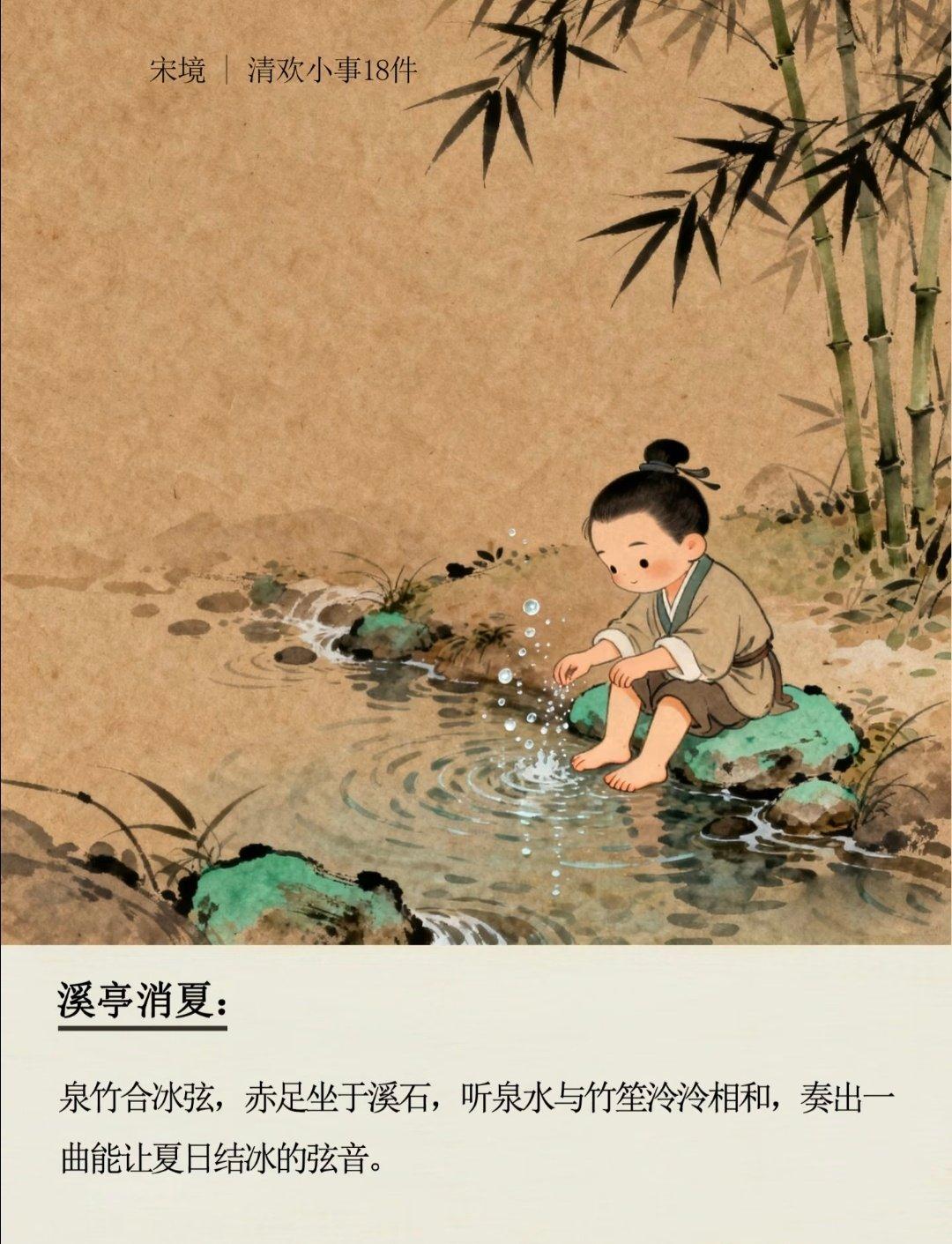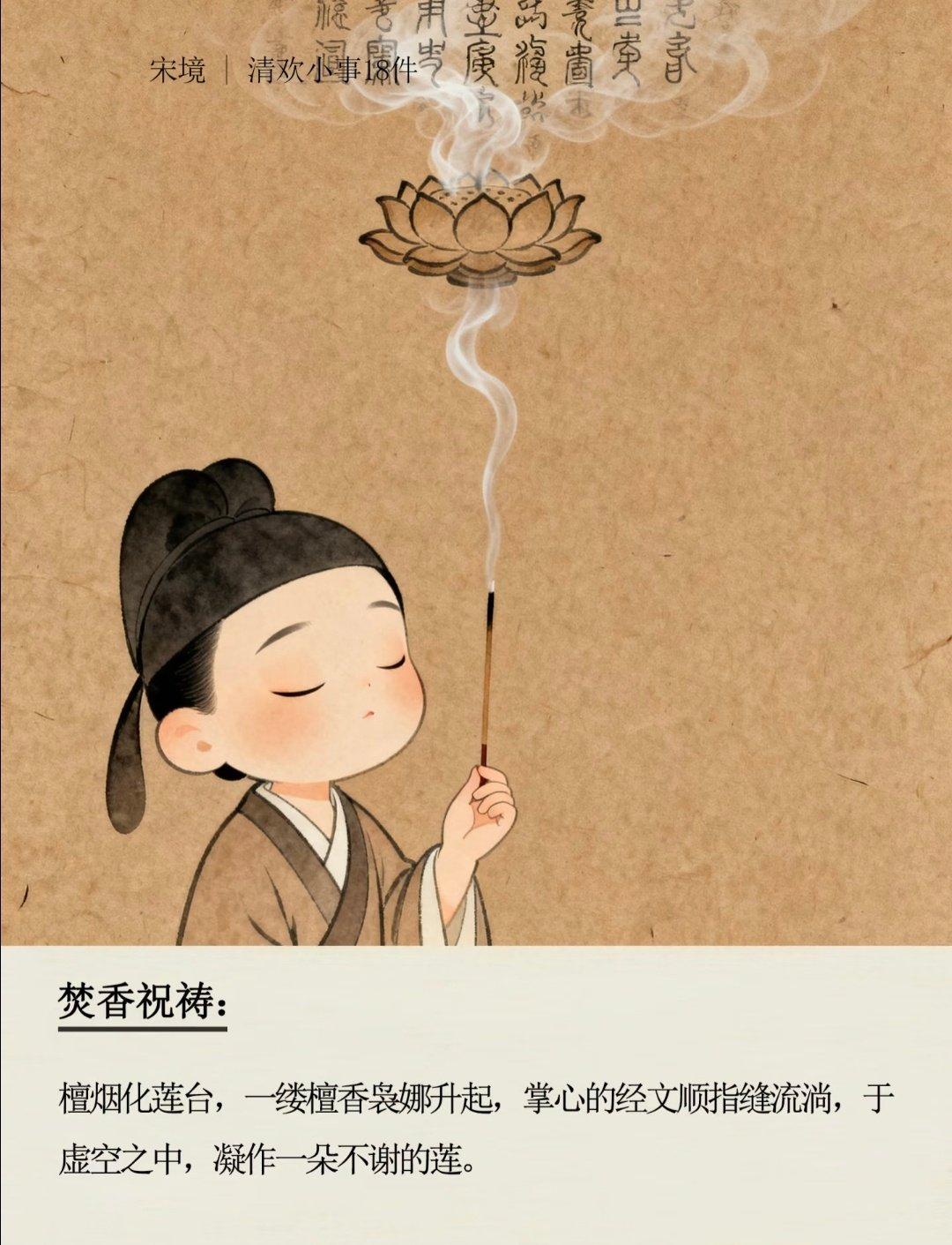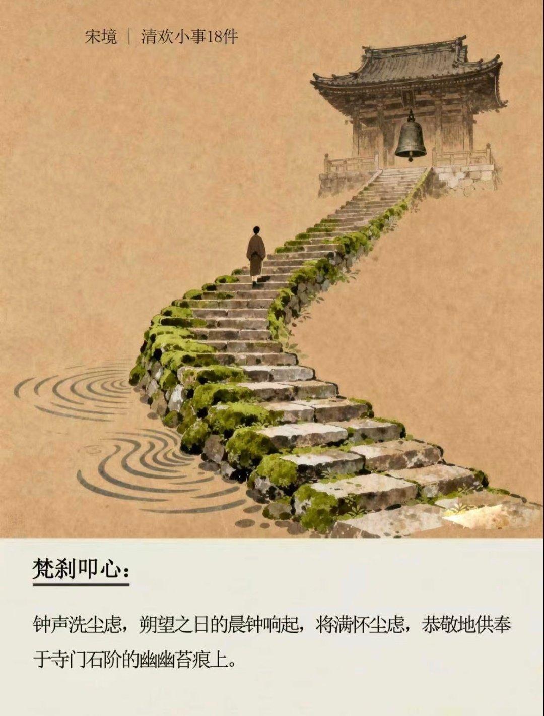 “宋境”制作的“17件治愈的清欢小事” 1. 焚香入静:取一枝沉香置于素炉,看青烟袅袅,闻香气幽远,在香烟缭绕中让浮躁退散,调和心气,安顿精神。 2. 点茶品韵:将茶饼碾粉,沸汤调膏,用茶筅击拂出绵密汤花,在点茶过程中感受心境的沉静,品味盏中风月。 3. 挂画寄志:根据季节更换画作,如春天挂《早春图》,夏日悬《荷塘消夏》,通过赏画心游物外,寄寓情志。 4. 插花赏趣:选一枝寒梅或一茎清荷,置于古瓶素瓷间,欣赏花枝俯仰、叶片向背的自然之态,于虚处藏情,感受生活爱意。 5. 清溪泛舟:在悠悠清溪中泛舟,观赏两岸风景,如苏子与友人游赤壁般畅所欲言,让心灵在自然中栖息。 6. 竹窗夜话:微雨之时,与挚友在竹窗下谈笑,让思绪在雨幕中飘荡,享受静谧而深刻的交流。 7. 临溪濯足:暑热之际,赤脚走入清凉溪水,感受透心凉意,在与自然的互动中获得生理和精神的放松。 8. 雨后看山:雨后登上高楼,观赏脱去尘埃、色彩斑斓的山岳,仿佛置身仙境,领略自然之美。 9. 柳堤闲行:在清风柳影笼罩下,于堤畔悠然散步,让时间仿佛停滞,感受万物的轻灵。 10. 花坞品茶:与好友齐聚花坞,品茶赏花,体会恬淡宁静,让生活渗透着文化香气与愉悦。 11. 山寺闻钟:聆听隔江山寺传来的悠悠钟声,伴随着江水流动,让心灵在钟声中得以平静。 12. 月下听箫:月光下,倾听东邻悠扬的箫声,看竹影摇曳,享受这难得的安静时光。 13. 晨兴品茗:清晨起来,品尝一瓯茗茶,伴着茶香阅读一卷书,为日常忙碌增添几分文化氛围。 14. 午间小憩:午后倦意袭来时,躺在藤枕上小憩片刻,在简单中感受幸福,治愈疲惫。 15. 汲泉烹茶:有好友光顾时,汲取泉水烹煮清茶,将情谊浸泡其中,感受情谊的酽厚温暖。 16. 抚琴会友:弹奏古琴,与知音之人分享音韵,在共鸣与理解中体会人生难得的快乐时光。 17. 观鸟听语:看鸟儿自由飞翔,聆听其悦耳鸣声,感受自然的灵动,让心灵更为欢跃。