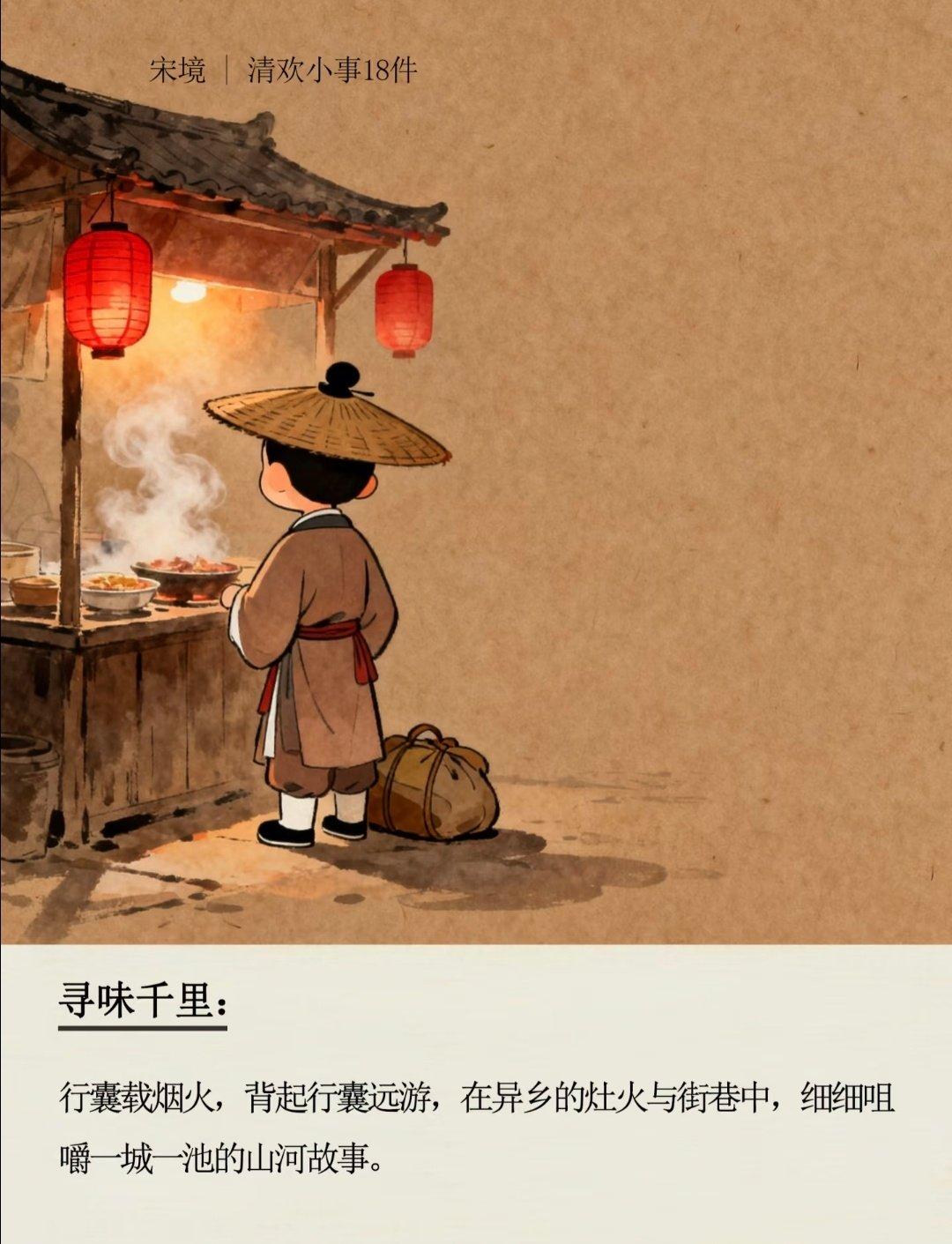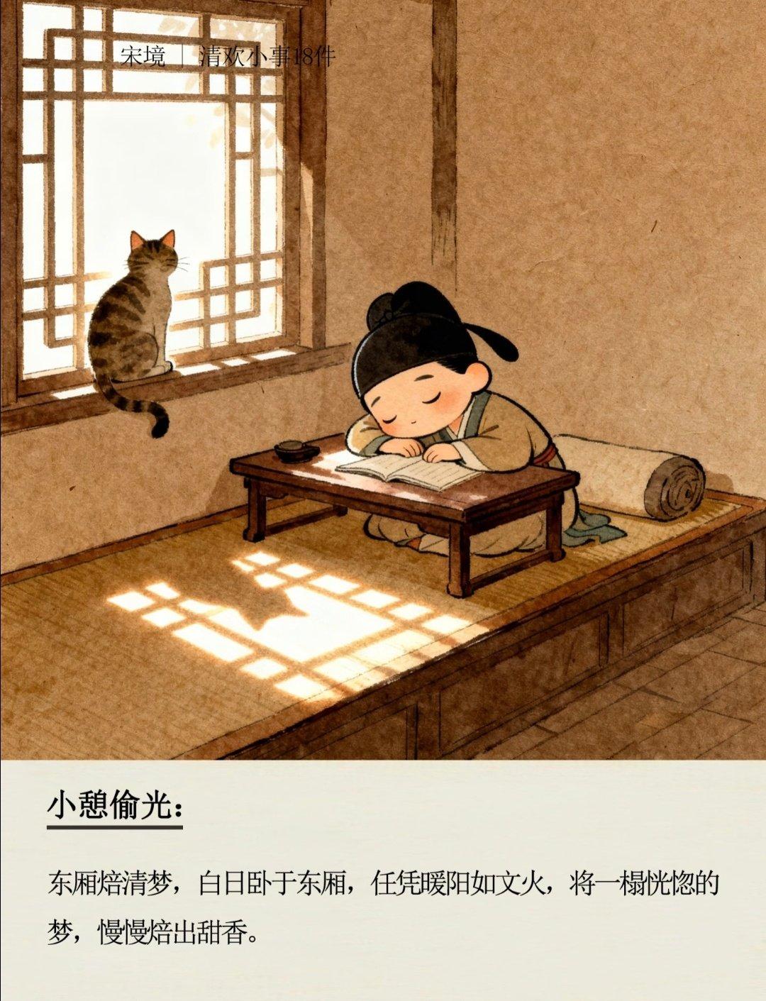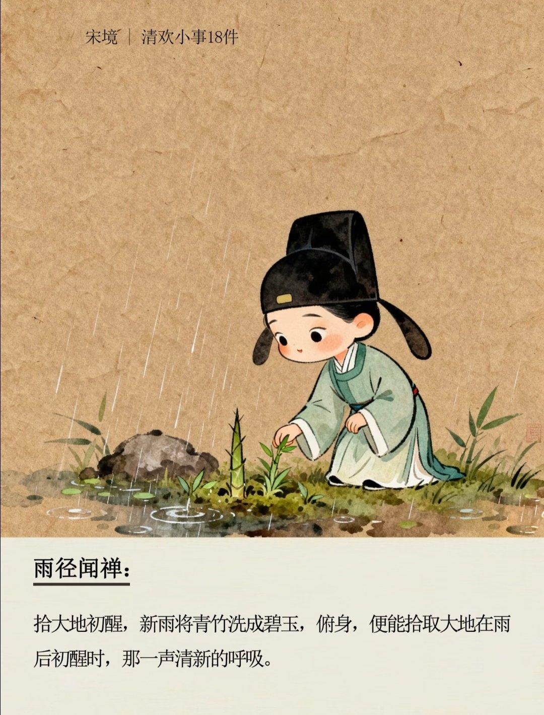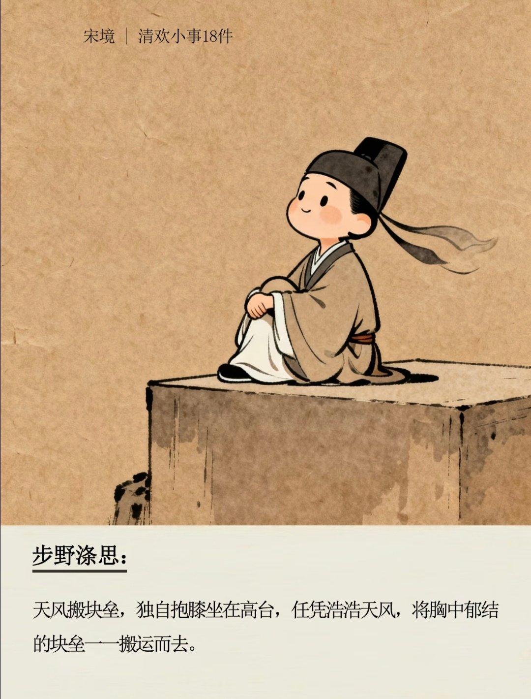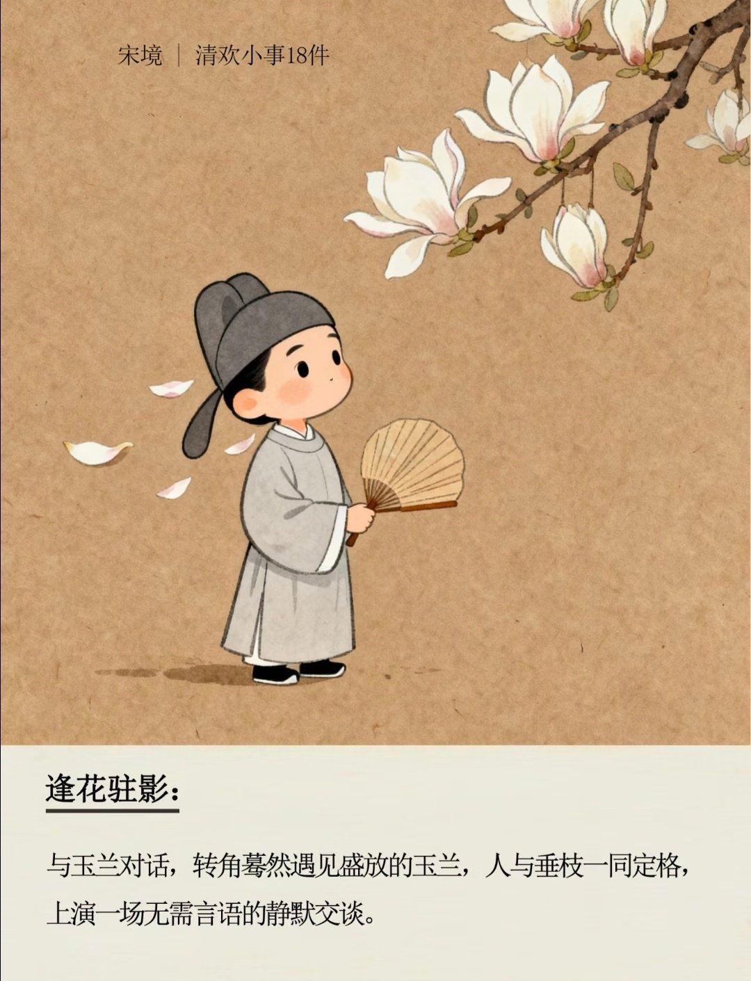 “宋境”制作的“17件治愈的清欢小事” 1. 焚香入静:取一枝沉香置于素炉,看青烟袅袅,闻香气幽远,在香烟缭绕中让浮躁退散,调和心气,安顿精神。 2. 点茶品韵:将茶饼碾粉,沸汤调膏,用茶筅击拂出绵密汤花,在点茶过程中感受心境的沉静,品味盏中风月。 3. 挂画寄志:根据季节更换画作,如春天挂《早春图》,夏日悬《荷塘消夏》,通过赏画心游物外,寄寓情志。 4. 插花赏趣:选一枝寒梅或一茎清荷,置于古瓶素瓷间,欣赏花枝俯仰、叶片向背的自然之态,于虚处藏情,感受生活爱意。 5. 清溪泛舟:在悠悠清溪中泛舟,观赏两岸风景,如苏子与友人游赤壁般畅所欲言,让心灵在自然中栖息。 6. 竹窗夜话:微雨之时,与挚友在竹窗下谈笑,让思绪在雨幕中飘荡,享受静谧而深刻的交流。 7. 临溪濯足:暑热之际,赤脚走入清凉溪水,感受透心凉意,在与自然的互动中获得生理和精神的放松。 8. 雨后看山:雨后登上高楼,观赏脱去尘埃、色彩斑斓的山岳,仿佛置身仙境,领略自然之美。 9. 柳堤闲行:在清风柳影笼罩下,于堤畔悠然散步,让时间仿佛停滞,感受万物的轻灵。 10. 花坞品茶:与好友齐聚花坞,品茶赏花,体会恬淡宁静,让生活渗透着文化香气与愉悦。 11. 山寺闻钟:聆听隔江山寺传来的悠悠钟声,伴随着江水流动,让心灵在钟声中得以平静。 12. 月下听箫:月光下,倾听东邻悠扬的箫声,看竹影摇曳,享受这难得的安静时光。 13. 晨兴品茗:清晨起来,品尝一瓯茗茶,伴着茶香阅读一卷书,为日常忙碌增添几分文化氛围。 14. 午间小憩:午后倦意袭来时,躺在藤枕上小憩片刻,在简单中感受幸福,治愈疲惫。 15. 汲泉烹茶:有好友光顾时,汲取泉水烹煮清茶,将情谊浸泡其中,感受情谊的酽厚温暖。 16. 抚琴会友:弹奏古琴,与知音之人分享音韵,在共鸣与理解中体会人生难得的快乐时光。 17. 观鸟听语:看鸟儿自由飞翔,聆听其悦耳鸣声,感受自然的灵动,让心灵更为欢跃。