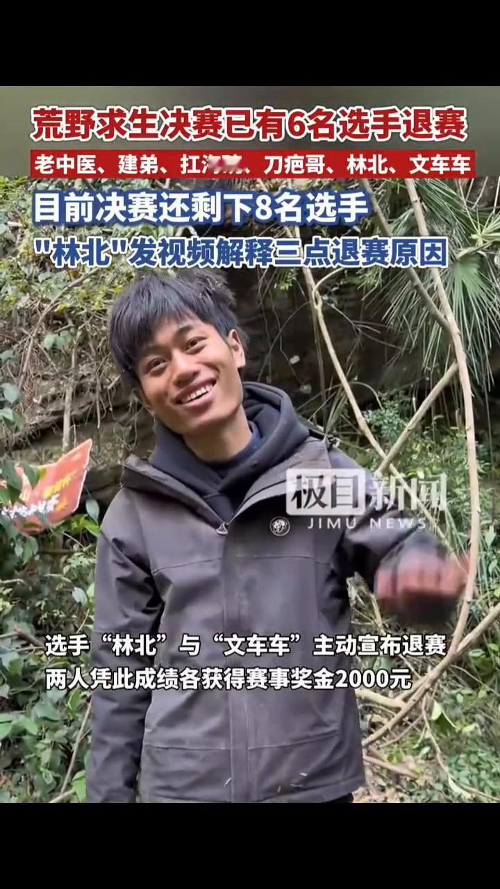 荒野求生决赛已有6名选手退赛,老中医、建弟、扛海碗、刀疤哥、林北、文车车,目前决赛还剩下8名选手。"林北"发视频解释三点退赛原因。 极目新闻。 12月3日,湖南张家界七星山荒野求生挑战赛人气选手"林北"发布视频解释了自己退赛的三点原因。 ·第一点原因是选手"林北"与"文车车"主动宣布退赛,两人凭此成绩各获得赛事奖金2000元。 ·第二点原因是决赛场地条件比较艰苦,作为荒野小白,活下去比较容易,活好真的很难。 ·第三点原因是选手"林北"称12月3日刚好是决赛的第10天这个节点,选择这时退赛比较好。