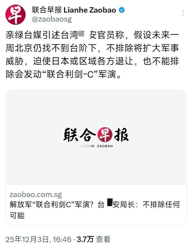新加坡联合早报12月3日写道:“亲绿台媒引述台湾安全官员称,假设未来一周北京仍找不到台阶下,不排除将扩大军事威胁,迫使日本或区域各方退让,也不能排除会发动‘联合利剑-C’军演。”   所谓“北京找不到台阶下”的假设,本质是绿媒替台当局编造的剧本,先虚构大陆“军事威胁”,再把自己包装成“受害者”,最终目的是转移岛内对民进党执政无能的不满。   这种操作在台湾早已不是新鲜事,就像2016年大陆休渔期结束后,《自由时报》炒作大陆渔船“集团化入侵”,声称渔民喊出“台湾是中国一省”,却绝口不提两岸渔业纠纷本可通过协商解决。   厦门大学教授张文生当时就点破,绿媒故意把民间渔业冲突政治化,就是为了煽动民众对大陆的敌意,掩盖蔡英文当局在民生议题上的不作为。   这种“贼喊捉贼”的戏码,在2024年解放军战机绕台时再次上演,亲绿媒体先造谣“歼-11锁定F-16”,台军先是否认后又被迫承认,全程配合演出“大陆挑衅—台军悲壮”的苦情戏,结果被岛内网友扒出雄三导弹曾误射渔船的陈年旧账,讽刺“航母杀手原来是渔船杀手”。   绿媒的癫狂,源于民进党当局的“投喂”。2025年3月华夏经纬网曝光,民进党上台9年给“三立”“民视”的媒体标案超百亿元,这些电视台每天的任务就是给民进党擦脂抹粉,或者把国民党的任何两岸互动都污名化。   比如2022年国民党副主席夏立言访陆,绿媒硬扯出朱立伦的小舅子随行,声称“国民党卖台”,却不敢提台湾农产品滞销时大陆的采购支持,更不敢算台湾对大陆贸易顺差每年超千亿美元的经济账。这种“既要大陆利益,又要挑拨仇恨”的分裂操作,连台湾《旺报》都看不下去,直斥绿媒“戴着绿色眼镜看台湾,只会制造对立”。   更值得注意的是,绿媒的“威胁论”往往与台当局的军事冒险同步。2024年台安全部门把网军扩编到千人,声称“因应大陆认知作战”,结果被网友嘲讽“嘴炮部队诞生”;2025年赖清德当局炒作“全民防卫”,要求高中生签战时服勤同意书,绿媒立刻配合造势,却绝口不提台湾青年最关心的是就业和房价。   这种“用战争恐惧绑架民意”的手段,连台安全部门前副秘书长杨永明都看不下去,直言“资通电军的网络攻击形同准军事行动,只会把台湾推向火坑”。   岛内民众其实早就看穿了这套把戏。2024年国台办曝光“台独”网军头目罗俊铭等人时,台湾网友的评论一边倒:“绿媒拿纳税人的钱造谣,还好意思说大陆认知作战?”   2025年赖清德被批“台积电赴美投资卖台”,绿媒急忙甩锅大陆“制造对立”,结果被《联合早报》挖出数据,台湾民众对两岸关系的焦虑,70%来自民进党激进政策,只有15%认为大陆是主因。就连被绿媒捧为“抗中英雄”的台军,私下也承认:“雄三导弹射程400公里,大陆航母根本不在射程内,说能‘反制’就是骗老百姓。”   现在的台海局势,最吊诡的是绿媒的“预言”往往自我实现。他们越炒作“大陆军事威胁”,台当局就越需要制造紧张来证明自己存在价值,结果两岸敌意螺旋上升,民进党反而能以“战时领导人”自居,继续垄断权力。   就像2020年解放军绕台时,绿媒编造“火控雷达锁定”的谣言,最终逼得台军不得不承认,反而坐实了大陆军事压力的真实性。这种“谎言成真”的恶性循环,让台湾社会陷入“恐惧—对抗—更恐惧”的死局,而民进党和绿媒却在其中赚得盆满钵满,代价却是台湾民众的安全感和未来。   回到《联合早报》的报道,所谓“联合利剑-C军演”的猜测,本质是绿媒替台当局找的“台阶”:把大陆正常军事活动歪曲为“找不到台阶下”的狂躁,既给赖清德当局的挑衅找借口,又能继续煽动“全民抗中”的情绪。   但岛内真正的明白人都清楚,大陆的对台节奏从来不以绿媒的噪音为转移,从2016年的渔船纠纷到2024年的网军打击,大陆始终掌握着主动权。台湾民众真正担心的,不是大陆的“军事威胁”,而是民进党当局把他们绑上“台独”战车,用绿媒的谎言掩盖政策失败,最终让台湾成为大国博弈的炮灰。   当绿媒天天念叨“大陆威胁”时,台湾彰化的果农正发愁菠萝卖不出去,高雄的青年在抱怨薪资十年不涨,台北的妈妈们在抢购平价鸡蛋。这些真实的民生焦虑,在绿媒的镜头里永远被“抗中”口号掩盖。   而大陆始终明白,收复台湾最大的阻碍从来不是美国的关税或军演,而是民进党当局用2000亿新台币媒体预算打造的“绿色铁幕”,他们用谎言编织了一个“全民抗中”的幻境,却忘了台湾民众骨子里流淌的,始终是不愿被裹挟、渴望和平的中华血脉。