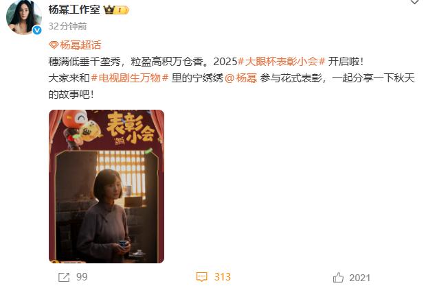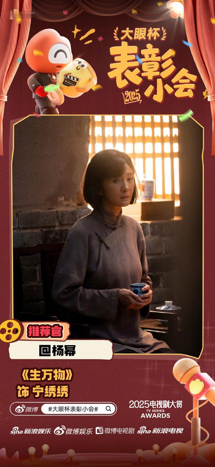杨幂工作室刚发的《生万物》新物料,直接把“秋天的故事感”拉满! “穗满低垂千垄秀,粒盈高积万仓春”,配上“大眼杯表彰小会”的可爱海报,杨幂演的秋绣绣穿着朴素的粗布褂子,手里端着瓷杯站在窗边,暖黄的光打在她短发上,那股年代里的温柔韧劲直接透过屏幕冒出来了——这哪是女明星,分明是扎根在土地里、带着烟火气的秋绣绣本人啊!