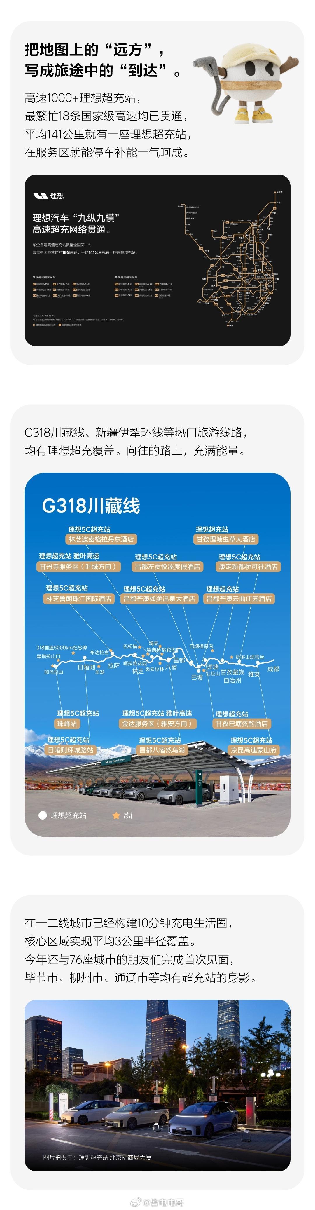 不知不觉,理想超充桩布局已经到了2万根了,一共用时2年8个月,成为超充桩数量全国第一的车企,也是车企自建高速超充站数量全国第一!也算是将之前自营充电布局不足的情况补回来了,而且最快的5C充电桩10分钟就能补电500公里,利好长途出行的用户。看这个高速的超充地图,理想在主要高速/城市间的布局还是比较均匀,优势挺明显的。理想汽车理想超充站新能源汽车