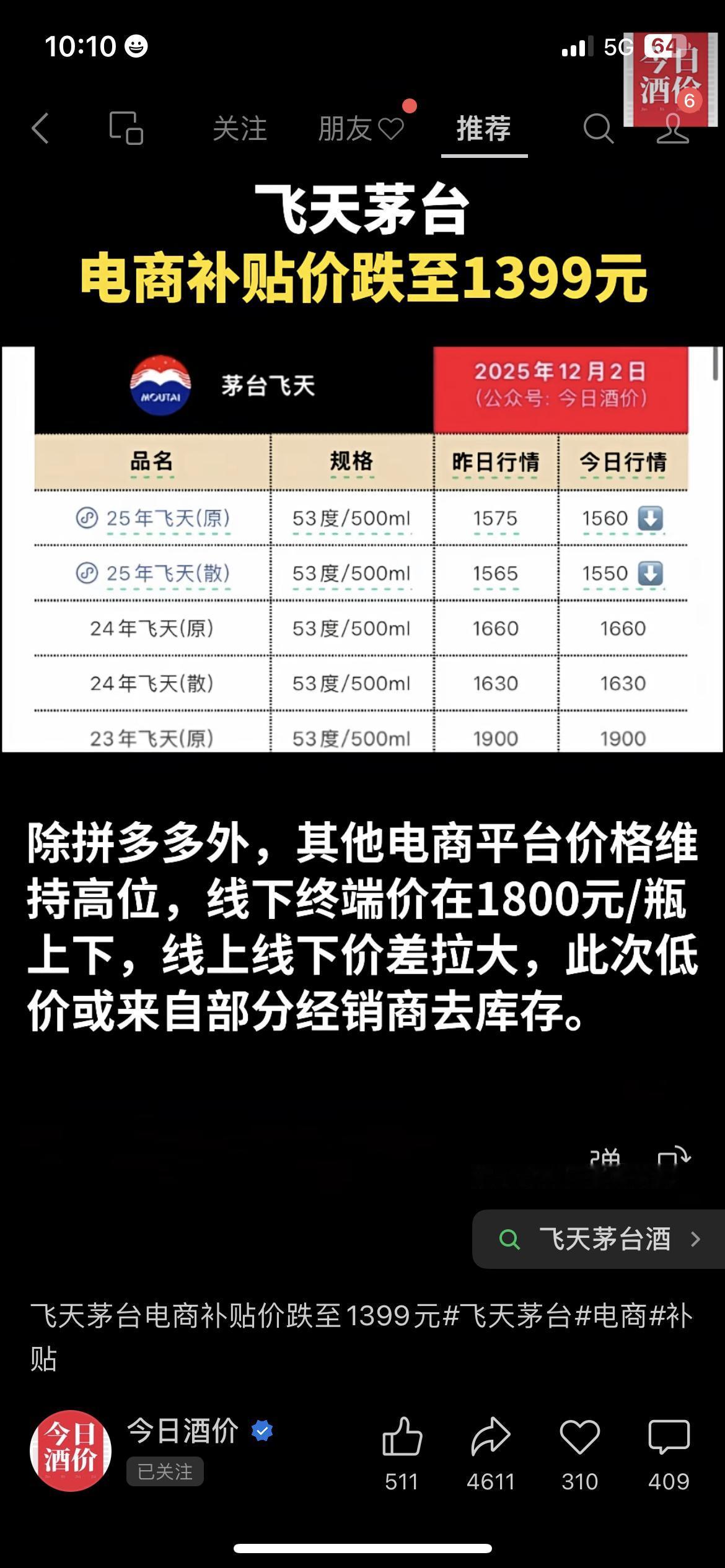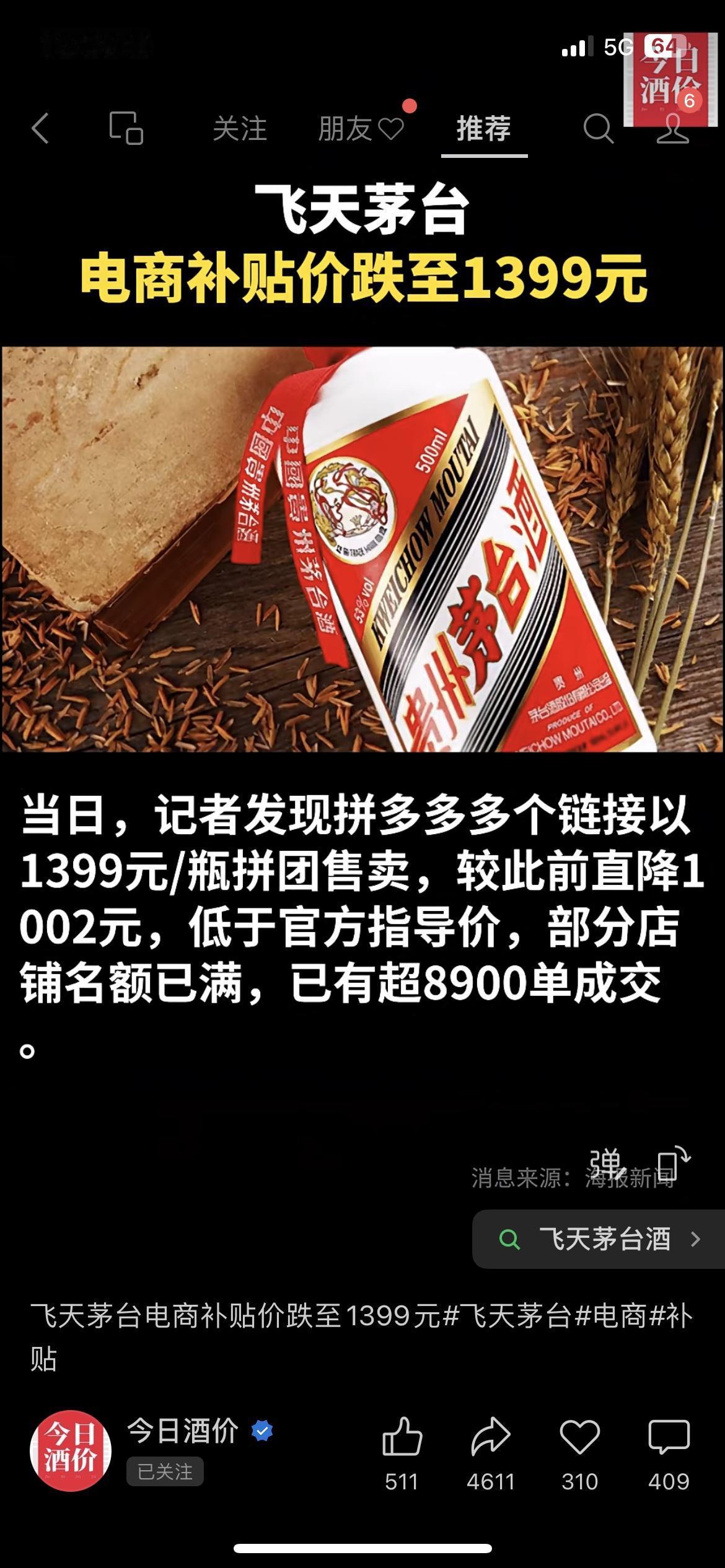 飞天茅台直接干到1399?拼多多这波补贴是来砸场子的吧! 刚刷到茅台价格直接懵了——拼多多上飞天茅台拼团价1399元?比官方指导价还低100块,直接降了1000多啊! 看了下数据,已经卖了8900多单,部分店铺都抢空了…但线下终端价还在1800左右飘着,这线上线下差价都能买半瓶了? 有人说这是经销商去库存,但不管啥原因,这价格是真敢打啊! 就想问:这波1399的茅台,你们抢到了吗? (小声说:低价归低价,买的时候还是认准靠谱店铺哈)茅台全线下跌 今茅台行情
