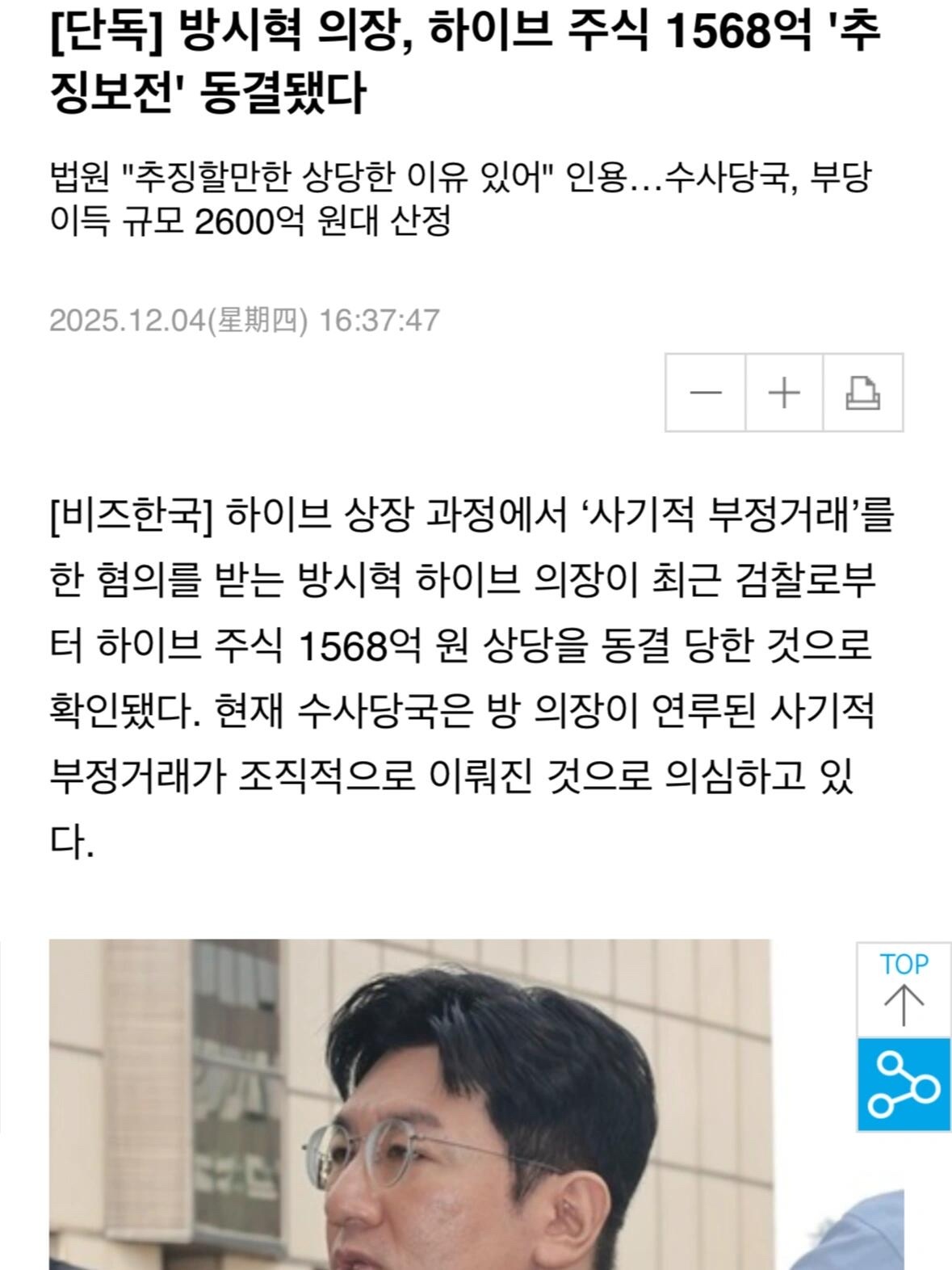 【独家】方时赫1568亿韩元HYBE股票被检方冻结据悉,调查机关目前怀疑方时赫所涉的不正当交易是有组织进行的,共计套现6322亿韩元。