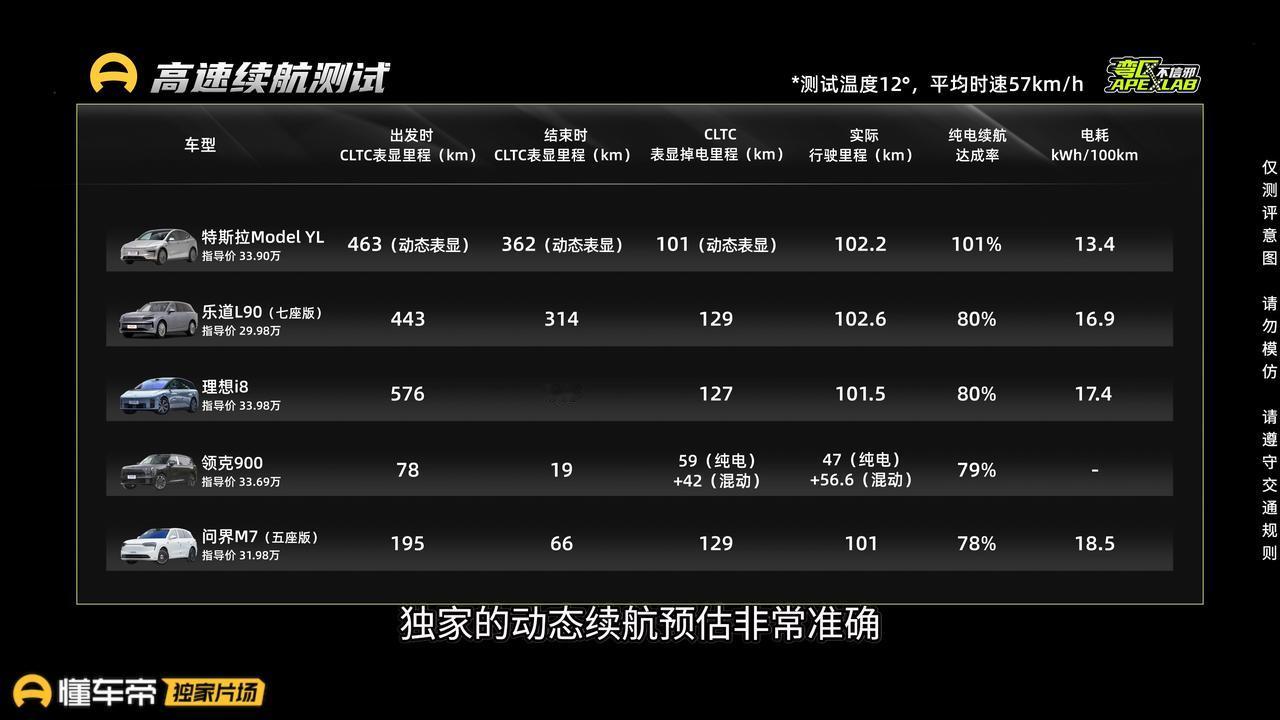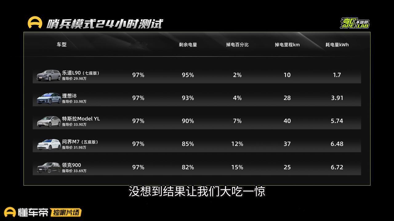 哨兵模式一天掉电15%?这也太费电了吧! 懂车帝做了一个20~30万热门新能源SUV大横评,其中一项,哨兵模式24小时耗电量,领克900消耗了15%的电量,当然因为它是插电混动车型,电池比较小,所以消耗电量占的比例比较大,实际消耗了6.72度电,特斯拉Model YL,消耗了7%的电量,续航掉了40km,消耗了5.74度电。问界M7消耗了12%,续航掉了37km,消耗了6.48度电,表现最优秀的是乐道L90,消耗了2%电量,掉了10km里程,仅消耗了1.7度电。 在续航测试中,特斯拉Model YL 实际续航达成率104%,这个表现确实不错,但是充电的时间却花了40分钟,是补能速度最慢的纯电车。补能速度最快的乐道L90仅用了5分钟时间,而且它的续航达成率也非常优秀,达到了86%。 在车内乘坐空间和储物空间的方面,乐道L90可以说里里外外都很优秀。在高速迷路测试当中,特斯拉Model YL不出意料的拿下了最好成绩,达到了126.8km时速,乐道L90比特斯拉Model YL重了300kg左右,却跟Model 并肩排在了前列,达到了122.5km时速。出乎意料的是乐到L90作为一个5米15的大车,转弯半径居然只有5.88m,他在停车入位,拐弯掉头的时候,操灵活性也表现很好。 这个测试非常有意思感兴趣的朋友们可以到懂车帝去看一看长视频!【来自懂车帝车友圈】