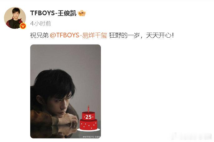 王俊凯祝易烊千玺狂野的一岁天天开心王源王俊凯为易烊千玺庆生 12月4日,晒照为易烊千玺庆生:“祝兄弟狂野的一岁,天天开心!” 随后,也在易烊千玺生日博评论:“千玺25岁快乐,祝你拥有美好的每一天。”