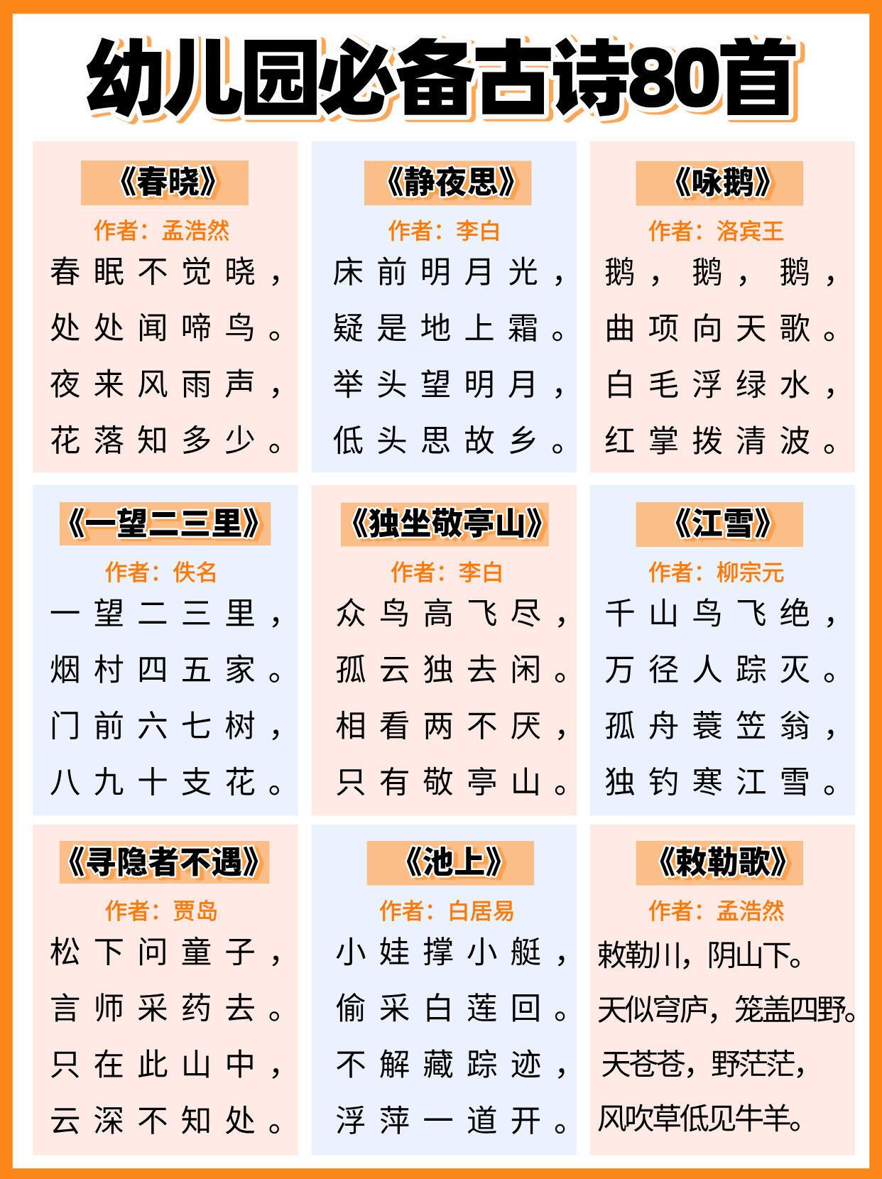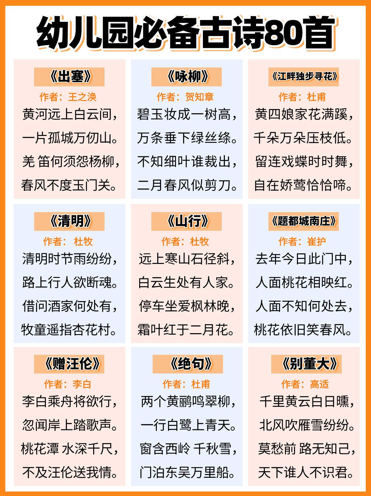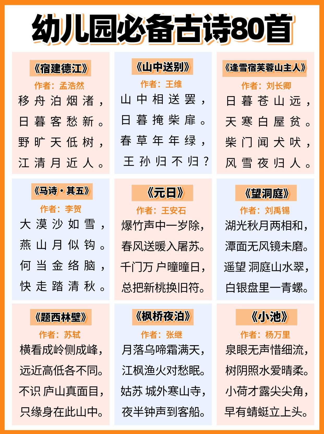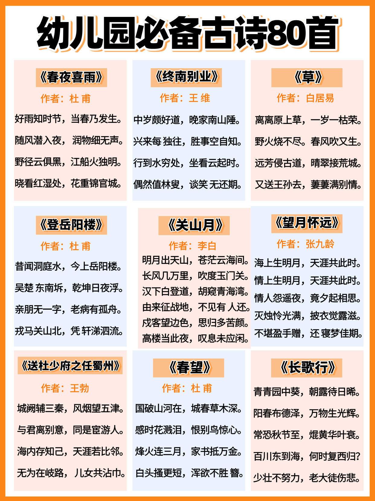 幼儿园必背古诗,全都给大家整理好在这里了,家有孩子的,建议家长们替孩子保存下来,抽空可以打印出来,每天陪着孩子读一读,背一背,孩子不但能轻松背完这些古诗,以后考试也能随时用上,进入幼儿园更赢在起跑线上。#长沙新朋友##寻美三湘# 【老师推荐】幼小衔接知识卡幼儿必备50首古诗启蒙早教120问知识卡