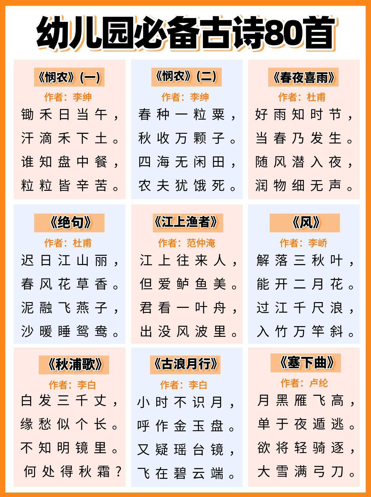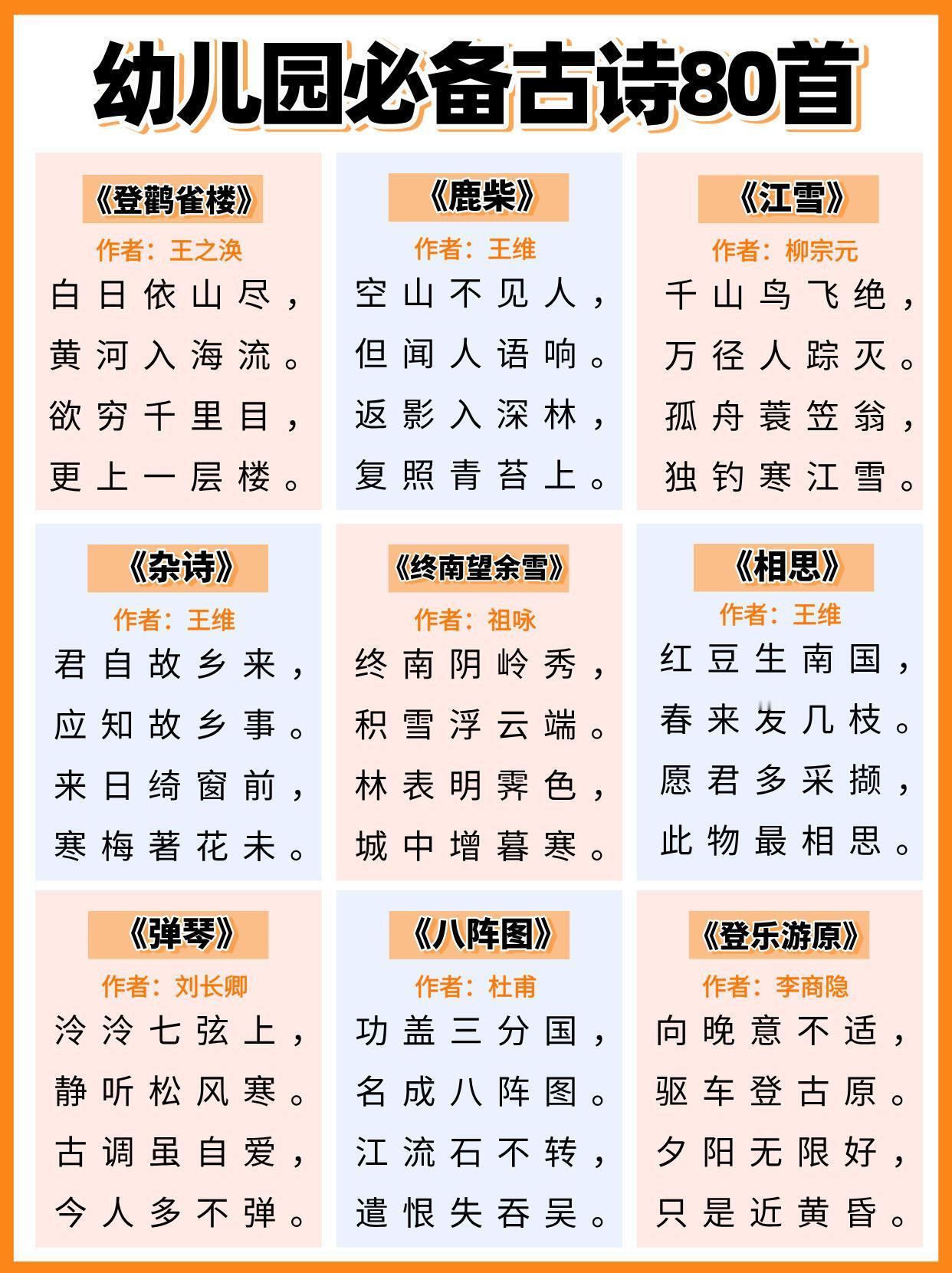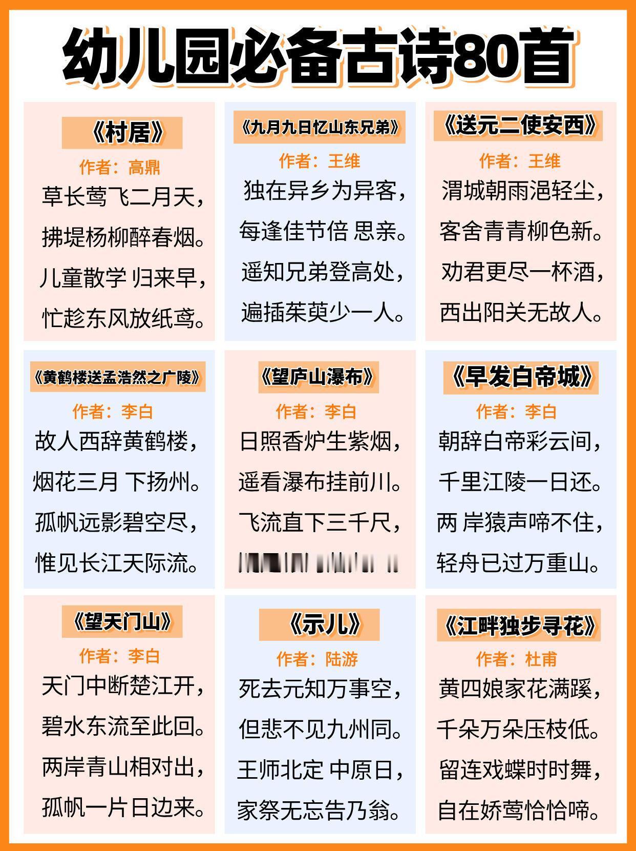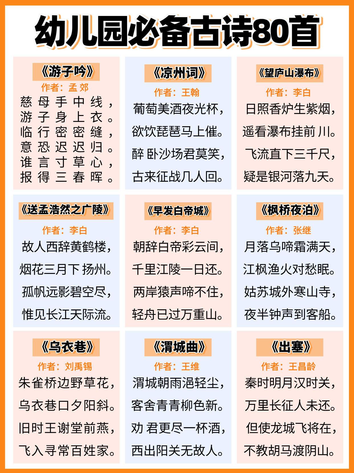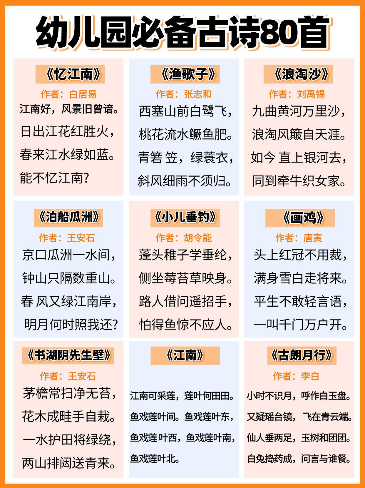 幼儿园必背古诗,全都给大家整理好在这里了,家有孩子的,建议家长们替孩子保存下来,抽空可以打印出来,每天陪着孩子读一读,背一背,孩子不但能轻松背完这些古诗,以后考试也能随时用上,进入幼儿园更赢在起跑线上。#长沙新朋友##寻美三湘# 【老师推荐】幼小衔接知识卡幼儿必备50首古诗启蒙早教120问知识卡