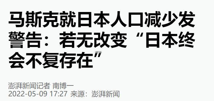 不得不说,马斯克这嘴真是开过光!就在中日关系这么紧张的节骨眼上,他居然直接给日本的未来判了“死刑”。 早两年马斯克就在社交平台上说过:“日本出生率要是赶不上死亡率,最后得没了。” 当时听着像危言耸听,现在看全是扎心的实话。2024 年日本厚生劳动省的账本一甩,全亚洲都安静了 — 去年新生儿刚凑够 68.6 万,首次跌破70万大关,这比日本官方自己的预测足足提前了15年。 而同期死亡人口却飙到160多万,一减一增之下,人口自然减少91.9万,创下历史最高纪录,连续16年萎缩的人口趋势根本刹不住车,联合国都预测到2100年日本人口得从现在的1.2亿跌到7685万,这可不是“最后得没了”的前兆么。 而且马斯克的SpaceX,早就在日本设研发中心时写进报告的“劳动力砍半,科技活力肯定掉链子”,如今更是句句应验。 日本15至64岁的劳动年龄人口占比已经跌到59.04%,而65岁以上老人占比快到30%,每4个就业者里就有1个是65岁以上的老年人,75岁以上的高龄老人都有11.4%还在干活,这哪里是“银发就业”,分明是劳动力缺口实在填不上的无奈。 有研究说等到2040年,日本劳动力缺口能超1100万,现在已经有342家公司因为没人干活直接破产,大阪有家轴承加工企业更夸张,员工最年长的都79岁了,想招应届毕业生都招不到几个。 科技领域的“掉链子”更是肉眼可见。日本IT行业早就遭遇无人可招的尴尬,87%的大型IT企业都喊着人才不足,上门的生意都得往外推。 这背后既有年轻人不够用的原因,也有行业自身的毛病,大企业拿项目后层层转包,到最下游的技术人员手里利润少得可怜,待遇差导致人才留不住,就算把技术签证门槛从10年经验放宽到2、3年,也填不上缺口。 连成田机场这种门面场所都得靠机器人救急,1.2米高的猫形机器人Pickru忙着卖伴手礼,一分钟就能完成选购支付全流程,可这看似新奇的“科技秀”,本质上是疫情后客流激增却没人手,已经影响到运营安全的无奈之举。 云雀餐饮旗下3000台猫耳机器人忙着传菜,喊着“您的订单到了,喵”配合高龄员工干活,一年能省50亿日元劳动力成本,可即便这样,餐饮行业还是1个求职者对应3个岗位,护理行业的空缺更是求职者的4倍。 日本政府砸钱搞“新机器人战略”,2025财年AI预算都给到1969亿日元,可机器人终究只是“缓冲装置”,2025年餐饮业服务机器人部署量比五年前涨了180%,用工缺口还是得靠老人、外籍员工和机器一起填。 而且最关键的是,劳动力结构失衡直接拖累创新,企业都在忙着解决“没人干活”的眼前问题,哪还有精力琢磨长远的科技突破,毕竟连维持现有产能都得靠70多岁的老人撑着,科技活力自然跟不上。 总和生育率1.15的数字更是扎心,不仅低于全球2.2的平均水平,连发达国家1.4的平均线都没摸到,远达不到2.07的人口替代率,东京都更是低到0.96。 年轻人未婚、晚婚、晚育的势头越来越猛,2024年初次生育平均年龄都到31岁了,40岁出头女性的生育数量都超过了20岁出头的,新生儿数量上半年才33.9万,连续4年低于40万,照这架势明年还得创新低。 马斯克当初的话听着刺耳,可SpaceX早就看透的劳动力与科技的关联,现在全成了日本绕不开的坎——没人,再厉害的科技也没底气运转,这可不是“外行乱放炮”,是把问题扒得太透了。