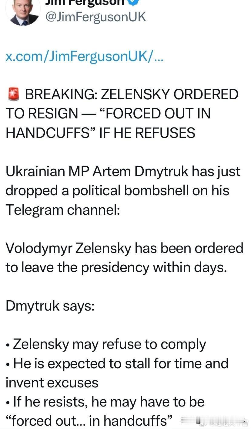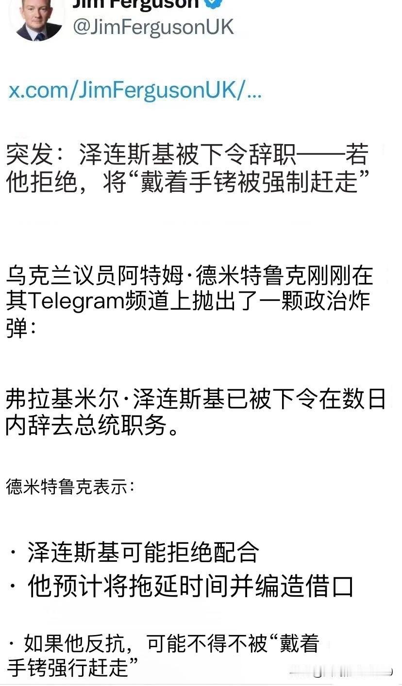 如果拒绝辞职将被“带上手铐”——乌克兰总统泽连斯基将被迫辞职。 消息称,乌克兰议员德米特鲁克刚刚在电报频道上抛出了一颗政治炸弹:乌克兰总统弗拉基米尔·泽连斯基已被下令,必须在数日内辞去乌克兰总统职务。 消息称,德米特鲁克表示:泽连斯基可能会寻找借口拒绝配合,以拖延时间。但同时,德米特鲁克也表示,如果泽连斯基拒绝辞职并进行反抗,可能不得不被“戴着手铐强行赶走” 值得注意的是,泽连斯基此前得力助手,乌克兰总统办公室主任叶尔马克因“腐败丑闻”被泽连斯基解职,叶尔马克过后表示并不怨恨泽连斯基。乌克兰媒体后来曝出,叶尔马克在得知即将被泽连斯基解职时,大发雷霆,当着泽连斯基的面破口大骂泽连斯基。而媒体认为,泽连斯基解职叶尔马克是“丢卒保车”,为了自保,不得不把叶尔马克作为“牺牲品”