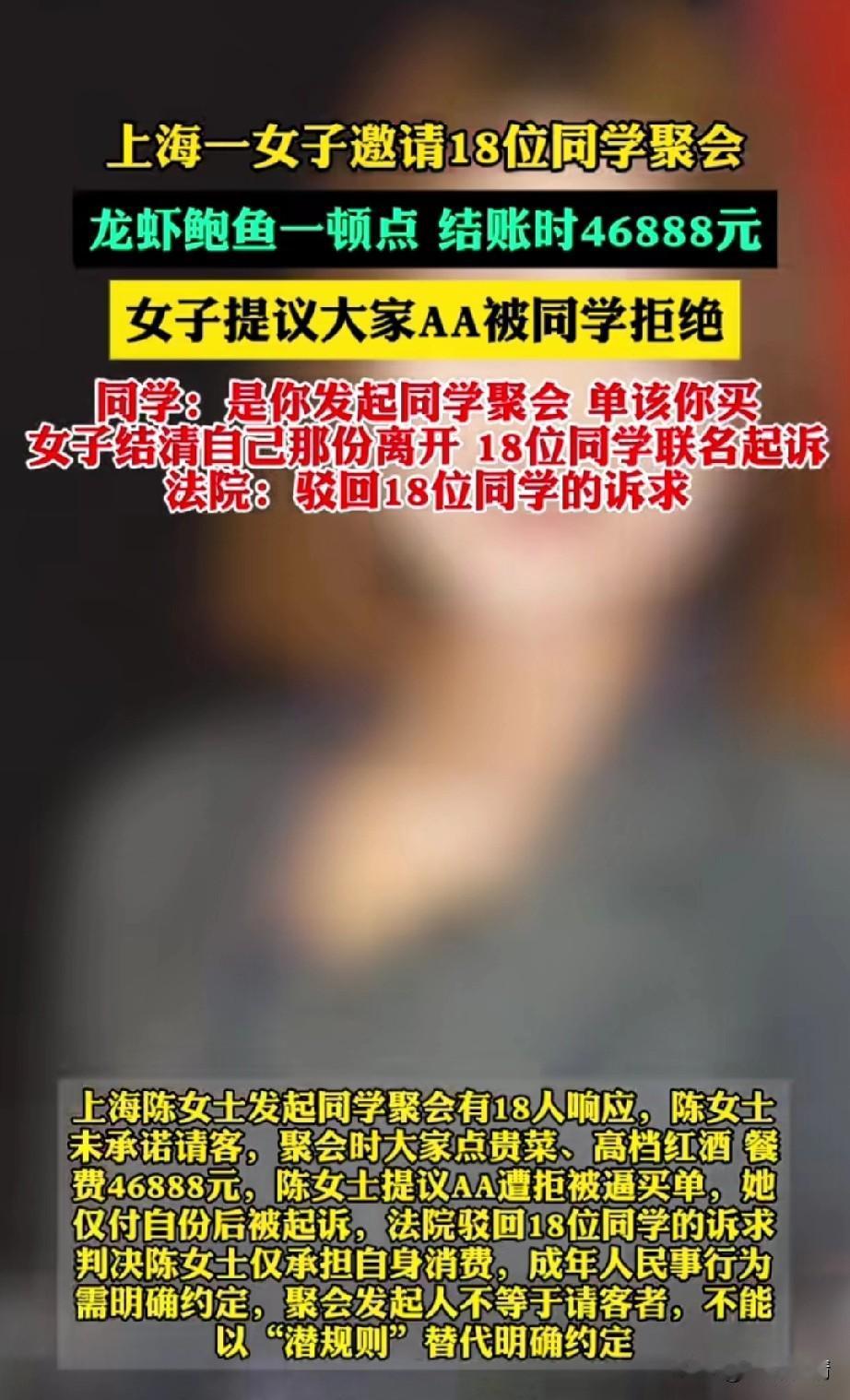 上海一女子邀请18位同学聚餐, 结果大家以为她请客, 龙虾鲍鱼一顿点, 把她当成了冤大头, 结账的时候显示账单46888元, 女子提议AA被同学拒绝, 同学表示聚会是你发起的, 单应该你买, 女子生气的只结了自己那份就离开了, 结果就被18位同学联名告了, 法院驳回了18名同学的诉求, 感觉该女子只需付自己的那份, 聚会的发起人不代表买单者, 这18位同学也不地道, 因为同学买单, 就疯狂的点单, 结果还要自己买单, 这样的同学聚会不参加也罢, 大家对于上海这位女同学的遭遇怎么看? 女生聚餐 上海聚餐餐厅 上海聚餐包厢 上海同学聚会