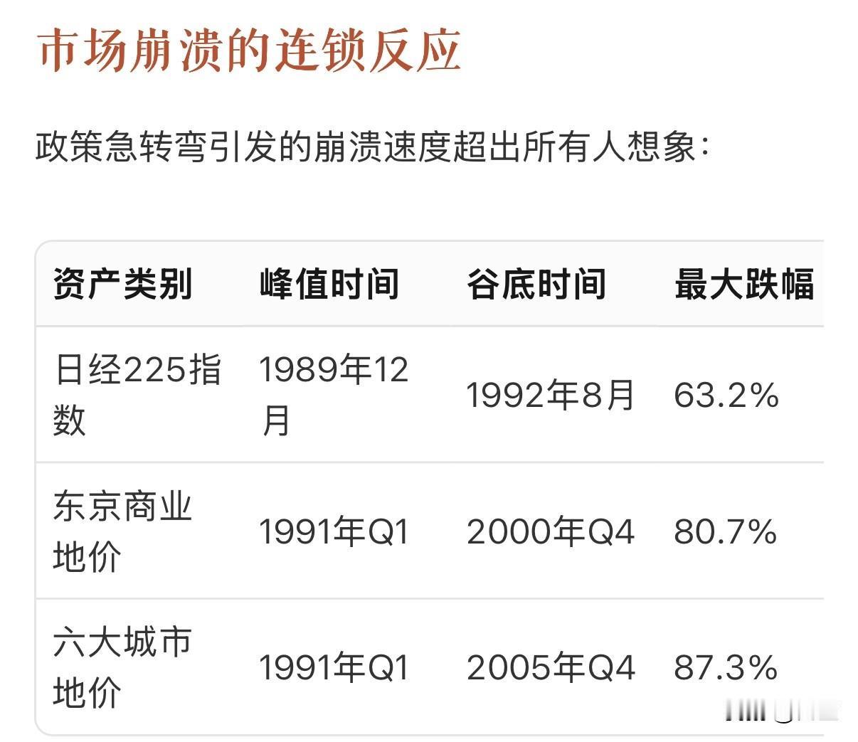 总结日本房地产, 第四篇:刺破泡沫的政策急转弯, 政策急转弯的致命时刻, 1989-1991年间,日本政府在短短18个月内完成了从"极度宽松"到"暴力紧缩"的政策急转弯,直接刺破了人类历史上最大的资产泡沫。这不是渐进式的政策调整,而是一场精心策划的"外科手术式"干预。 货币政策:从2.5%到6%的致命一跃, 1989年5月,日本央行新任总裁三重野康上任伊始,就开启了史无前例的加息周期。在短短8个月内,央行连续5次加息,将贴现率从2.5%的历史低点暴力拉升至6.0%,相当于给滚烫的经济浇下一盆冰水。 1989年5月贴现率调整2.5%→3.25% ,市场反应,日经指数短暂回调5%。 1989年10月贴现率调整3.25%→3.75%,市场反应,东京地价成交量下降15%。 1989年12月贴现率调整3.75%→4.25%市场反应,房地产贷款增速首次跌破20%。 1990年3月贴现率调整4.25%→5.25%,市场反应,日经指数单日暴跌7%。 1990年8月贴现率调整5.25%→6.0% ,市场反应,地价开始雪崩式下跌。 土地融资管制:大藏省的"核选项", 1990年3月27日,日本大藏省颁布《关于控制土地相关融资的规定》,这纸文件被称为"刺破泡沫的核按钮"。 该规定要求: 1,总量控制:所有金融机构的房地产贷款增速不得超过总贷款余额增速。 2,窗口指导:央行对商业银行新增贷款进行逐月审查。 3,惩罚机制:违规银行将被限制再贴现窗口使用权。 市场崩溃的连锁反应, 政策急转弯引发的崩溃速度超出所有人想象: 日经225指数 在1989年12月到1992年8月 间最大跌幅63.2%。 东京商业地价 在1991年Q1到2000年Q4间 最大跌幅80.7%。 六大城市地价 在1991年Q1到2005年Q4 间最大跌幅87.3%。 政策制定者的致命误判, 事后复盘,日本政策制定者犯了三个致命错误: 误判一:相信"软着陆"的可能性, 三重野康在回忆录中承认,当时央行内部普遍认为"通过快速加息可以挤出泡沫,同时避免经济硬着陆"。这种误判导致加息节奏过于激进。 误判二:低估金融系统的脆弱性 大藏省官员后来透露,实施土地融资管制时,完全没有预料到会引发银行系统的连锁反应,导致整个信贷体系冻结。 误判三:错失政策转向窗口 1990年股市暴跌后,日本央行仍坚持紧缩政策长达9个月,直到1991年7月才开始降息,此时资产价格已崩溃。 民众的真实感受, 泡沫破裂后的日本社会经历了从"财富狂欢"到"资产负债表衰退"的心理剧变: 1989年底:东京银座街头仍充斥着"一亿日元一平米"的地产神话。 1990年3月:首次出现"负资产"家庭,房贷余额超过房产价值。 1991年:自杀率同比上升15%,其中40%与房地产债务相关。 1992年:出现"失落的十年"社会概念,消费萎缩30%。日本房产 日本楼市