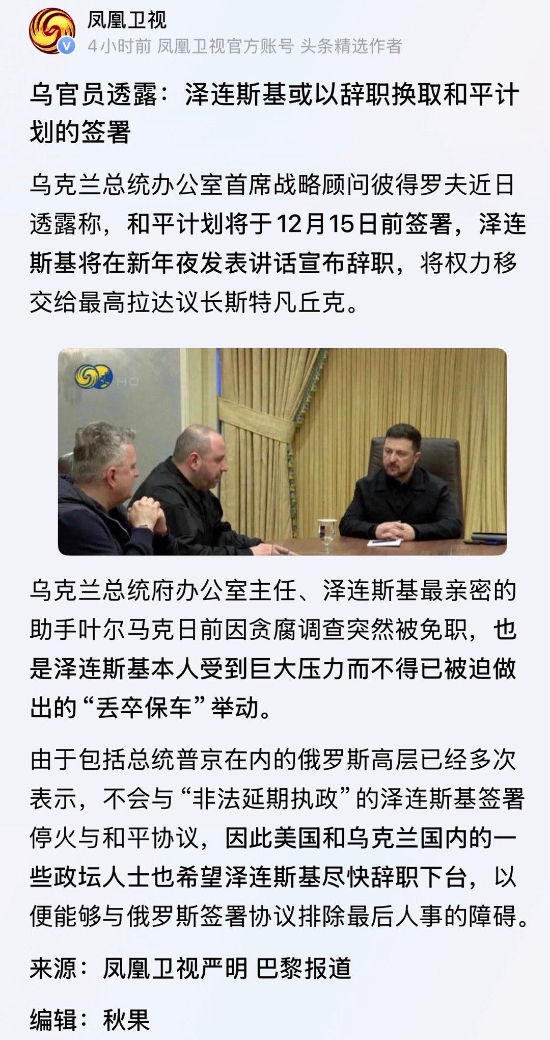 有这消息?那就坐等,官媒凤凰卫视报道真假10日前后即能验证。乌官员透露:泽连斯基或以辞职换取和平计划的签署…俄乌战争