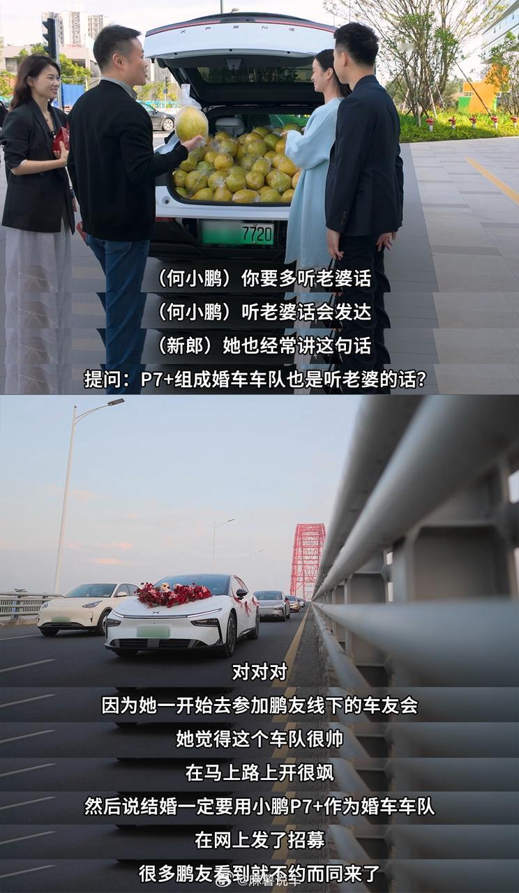 广西这对95后新人也太暖了~ 婚礼用7台小鹏P7+组婚车队,被何小鹏翻牌祝福后,居然开着P7+往返1200km,从广西带喜糖和400斤柚子去广州致谢!何小鹏也是很会啊!居然回赠珍藏佳酿和“嫁女饼”,寓意小鹏汽车是车主娘家人,这双向奔赴也太甜了吧~新婚车主奔赴千里给何小鹏送喜糖何小鹏送P7+新婚车主嫁女饼