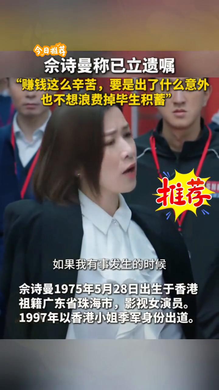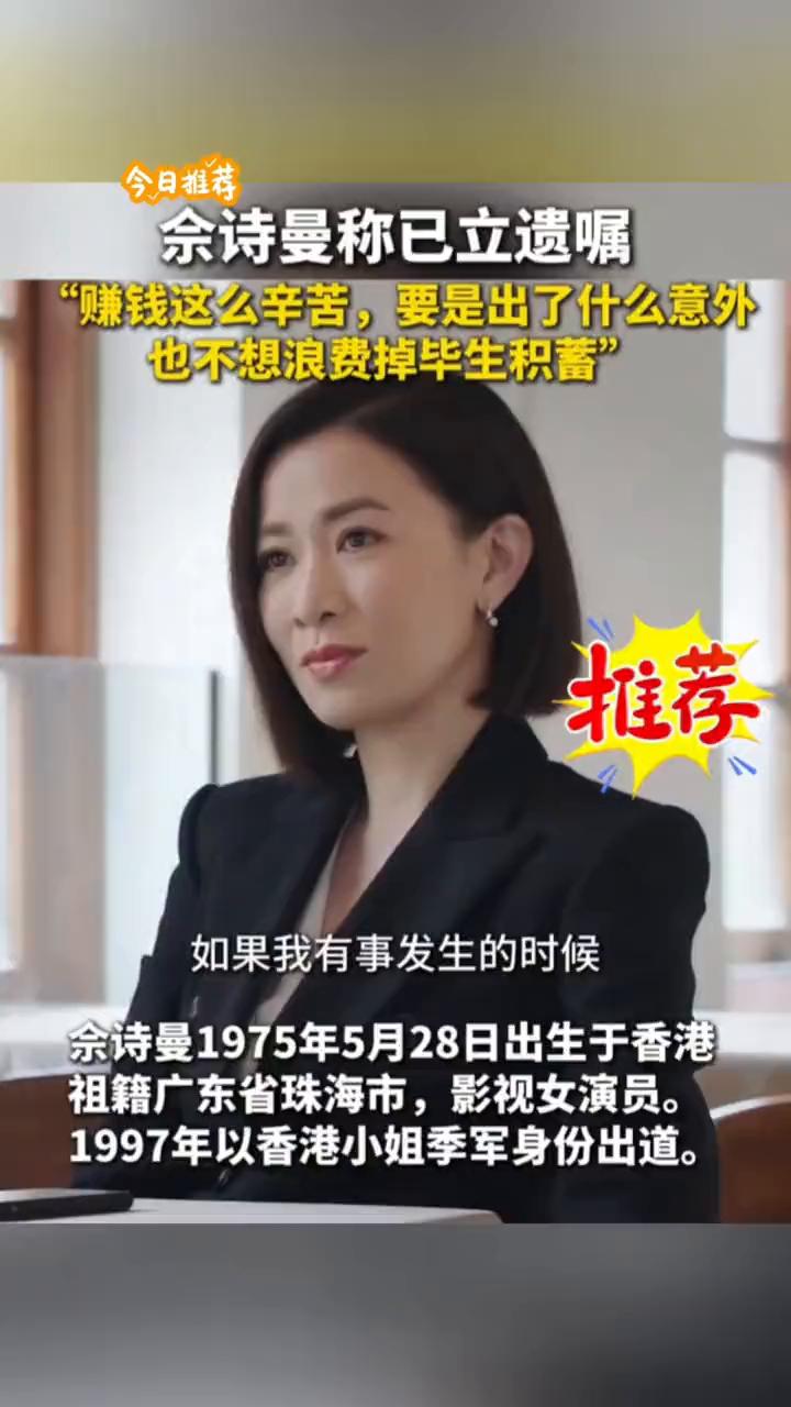 今日推荐:佘诗曼称已立遗嘱:"赚钱这么辛苦,要是出了什么意外也不想浪费掉毕生积蓄"。 佘诗曼1975年5月28日出生于香港,祖籍广东省珠海市,影视女演员。1997年以香港小姐季军身份出道。 据12月4日报道,余诗曼在最新采访表示已立下遗嘱。 早阵子,我赚钱这么辛苦,如果我有事发生的时候不要浪费我毕生积蓄。 曾出演《宫心计》、《使徒行者》、《延禧攻略》等多部知名剧集,今年11月主演的电视剧《新闻女王2》播出。 喜欢就点个关注吧!