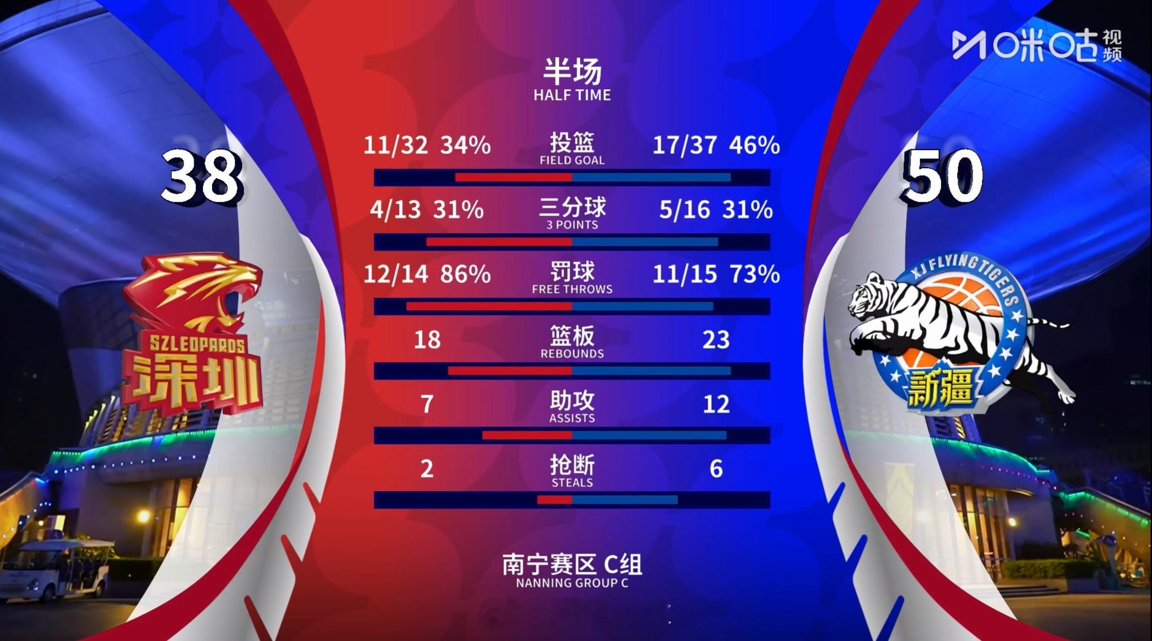 半场比赛结束!深圳男篮38:50新疆男篮,伊福半场17分、吴冠希的防守做的也非常不错!cba俱乐部杯新疆男篮阿才说球CBA新疆广汇男篮