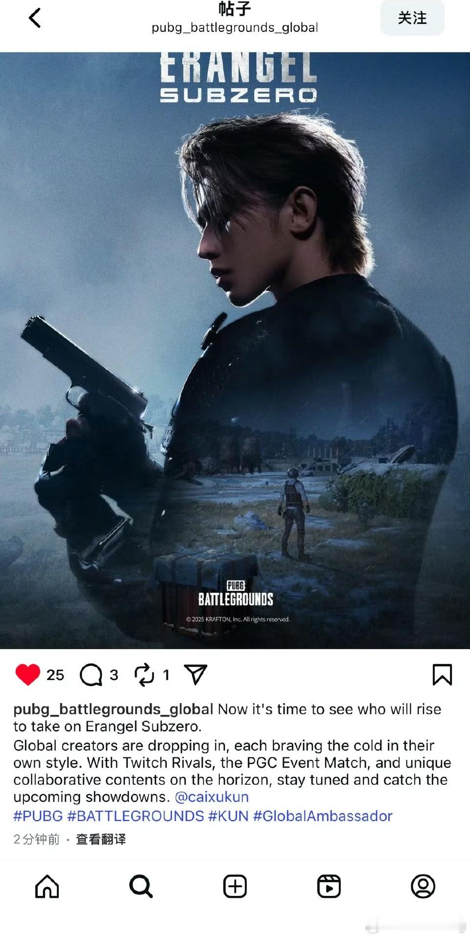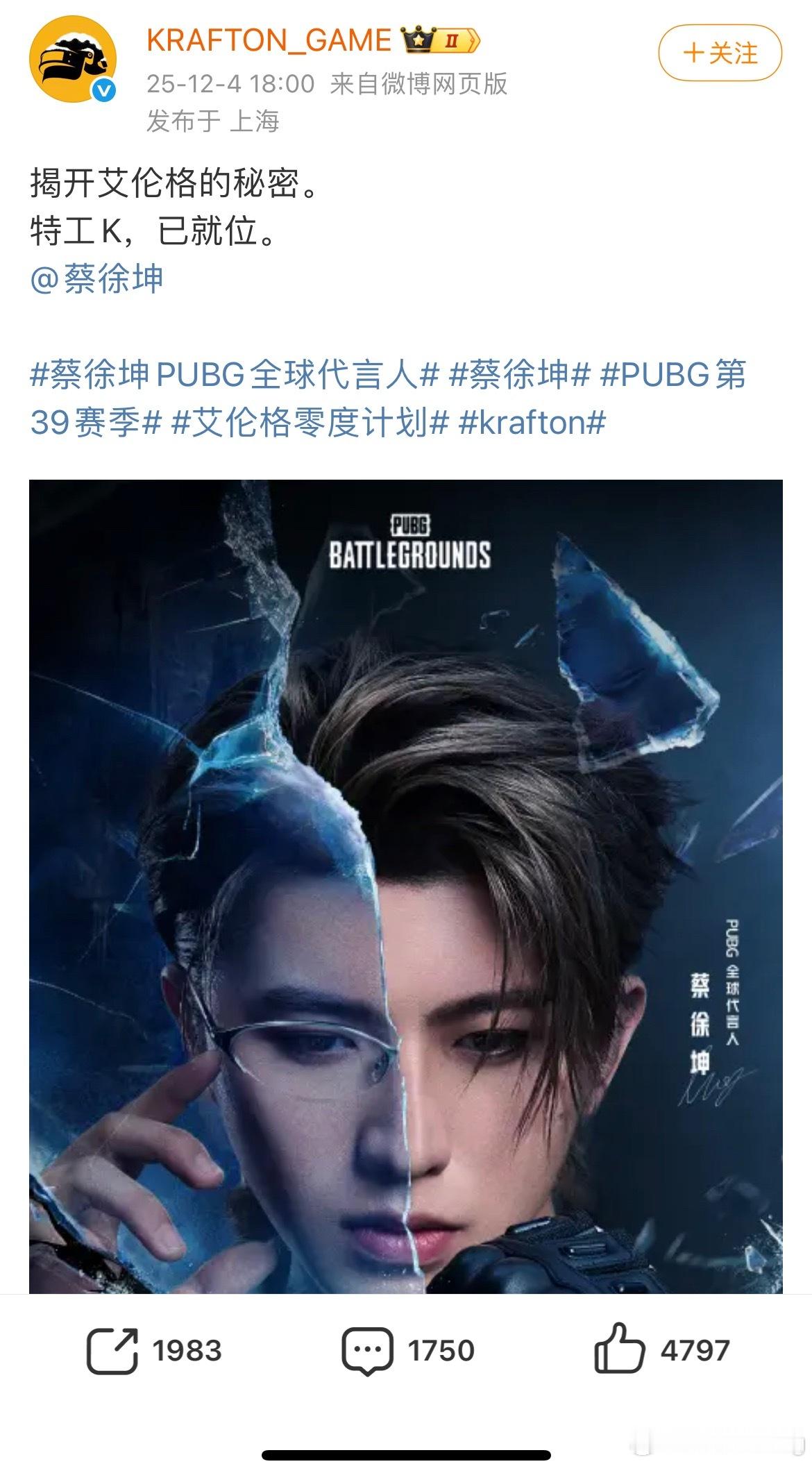 蔡徐坤官宣PUBG全球代言人 外网同步官宣…最高抬头吧,好像压咖了权志龙 ,真牛