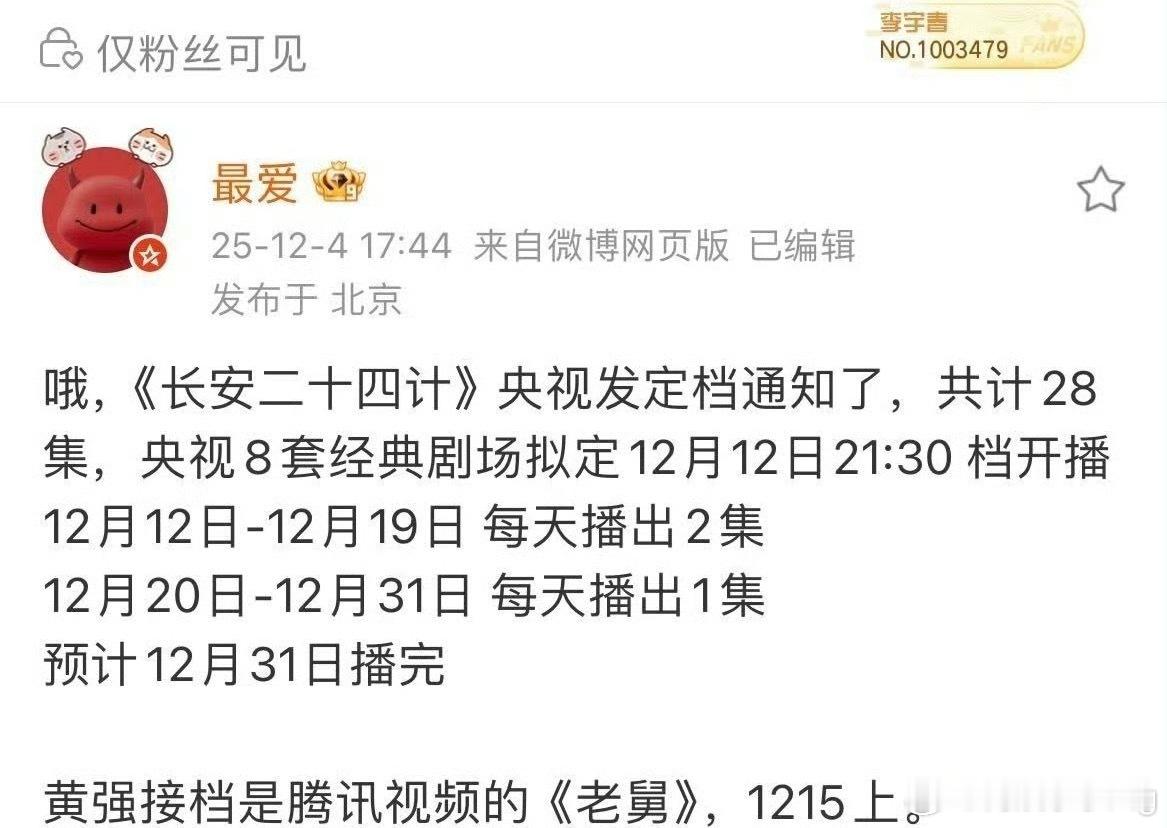 成毅长安二十四计央视排播瓜…12~19每天2集…20~31每天1集…我还挺满意这个排播的…