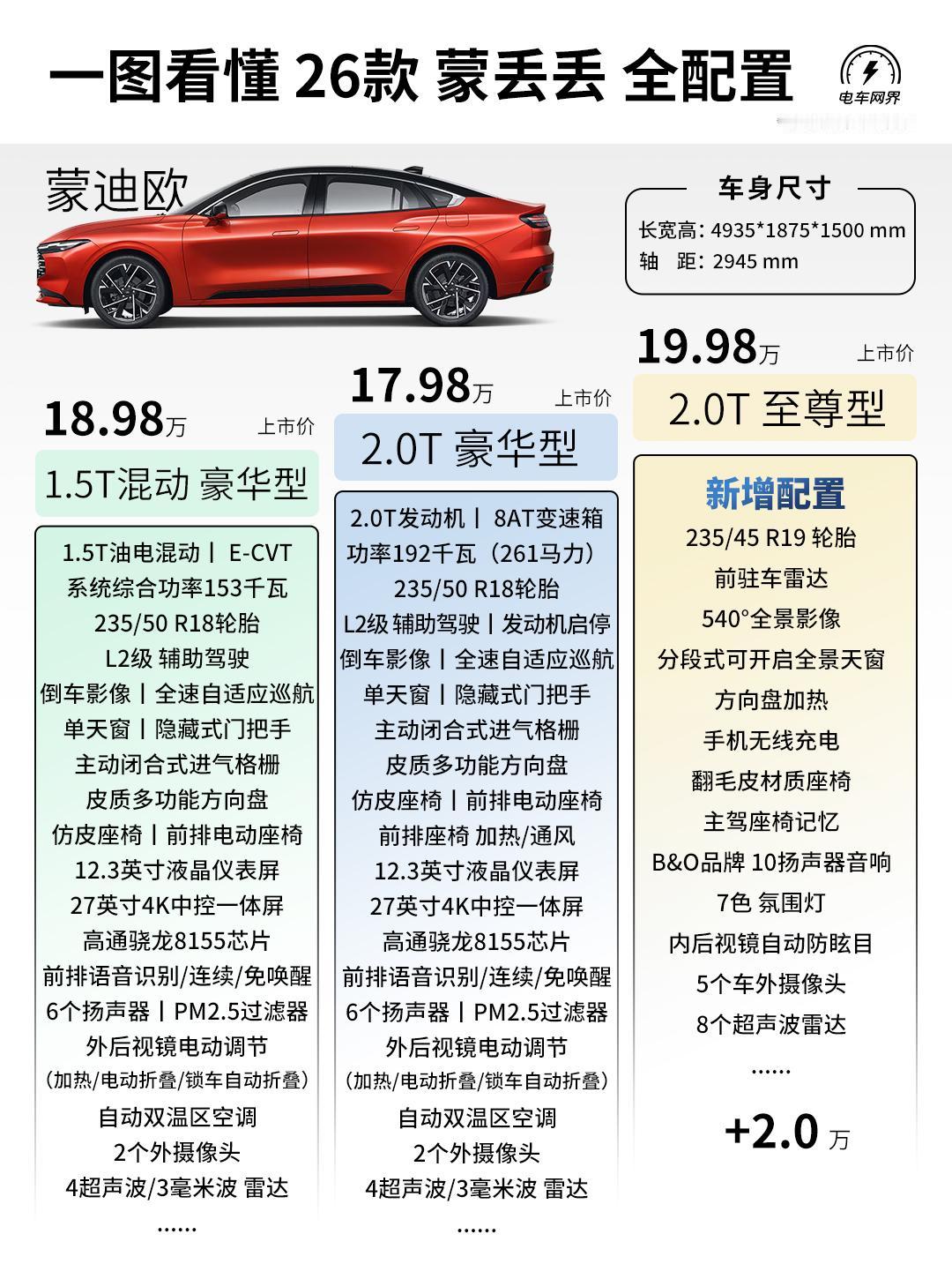 26款福特蒙迪欧来了,14.98万元起,共6个版本可选,具体配置(如上图)。 简单总结一下,主要升级集中在四个地方: 外观:前脸换了,八边形中网+新车灯,尾灯神似福特野马,同款三柱设计,新增赤霞红、沧海蓝车色。 内饰:换装悬浮中岛,车内材质提升,新增空调实体按键,储物空间升级到47.5L,后备厢空间520L。 智能:12.3英寸仪表+27英寸一体大屏,升级8155芯片、高德地图和Carplay(最低配除外)。 动力:提供1.5T、1.5T油电混动以及 2.0T EcoBoost发动机可选,2.0T版最大马力261Ps、408N·m,比现款稍微提升那么一丢丢,匹配8AT变速箱,零百加速达到6秒级。 大家觉得这个价格怎么样?哪个版本最适合你呢?【来自懂车帝车友圈】
