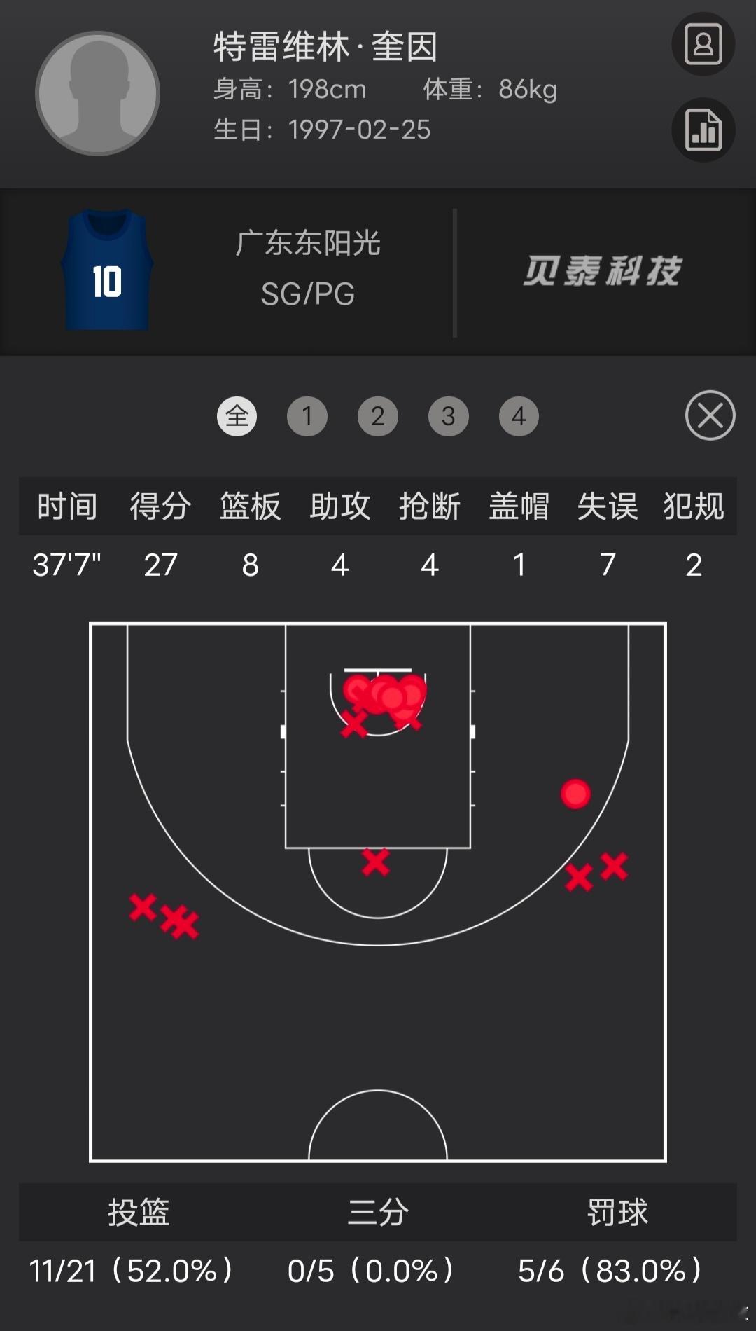 27分8篮板4抢断但有7失误,三分5中0大家满意新援奎因的首秀吗?能量十足的锋线,每球都想起飞暴扣,抢断犀利推反击高手,但阵地进攻处理球一般,这场三分失准 cba俱乐部杯赛