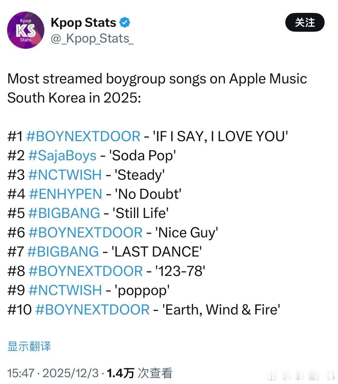 2025年韩区AppleMusic上播放量最高的男团歌曲: