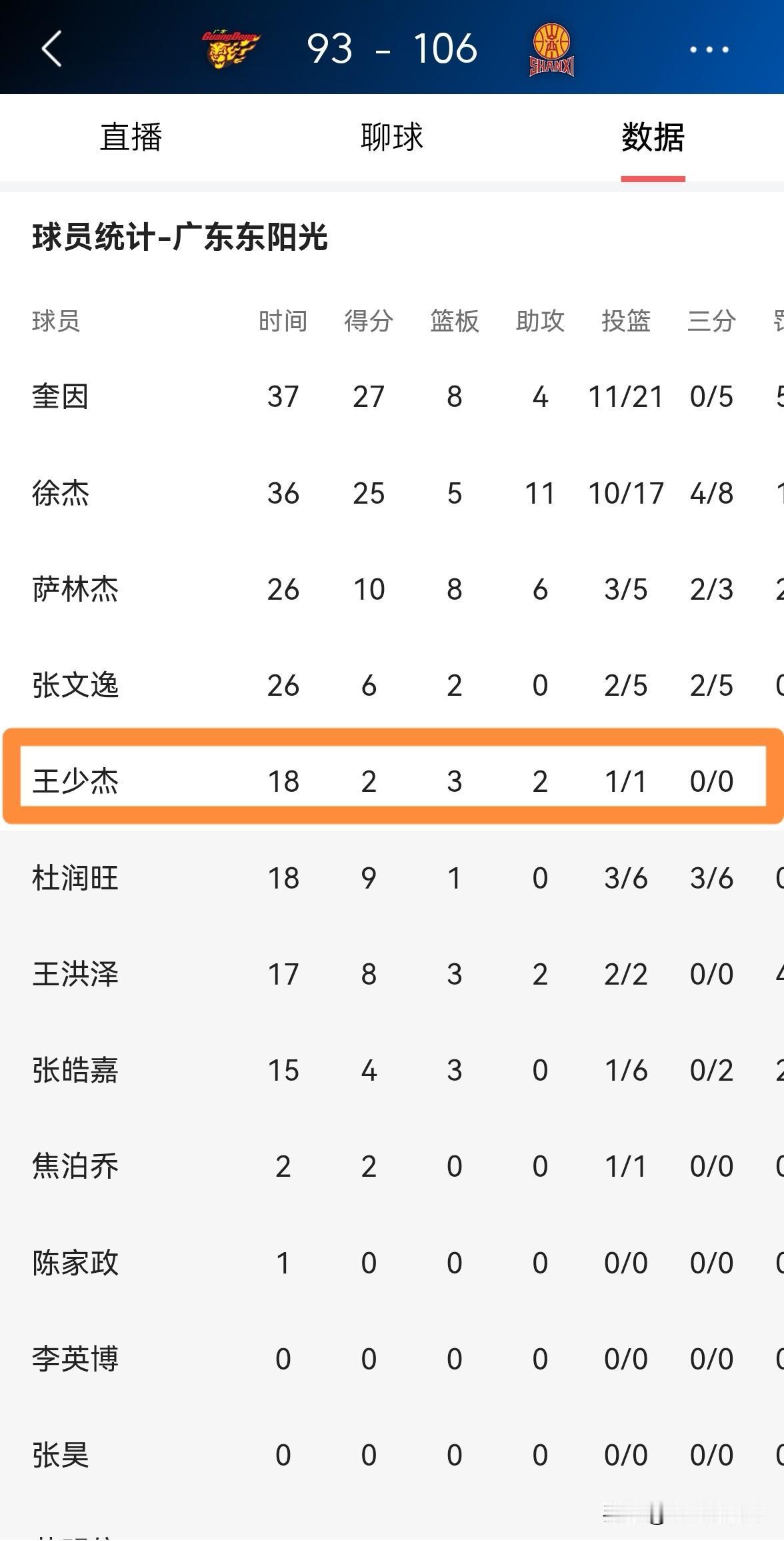 广东东阳光中锋王少杰真是难堪大用!在今天广东东阳光以93:106输给山西汾酒的比赛中,王少杰惨遭刘传兴的完爆。 整场比赛下来,王少杰首发出战18分钟,投篮1中1得到2分3篮板2助攻,他的场上正负值为-11。 作为一名中锋,王少杰最大的缺点就是太软了,他在篮下缺乏侵略性。
