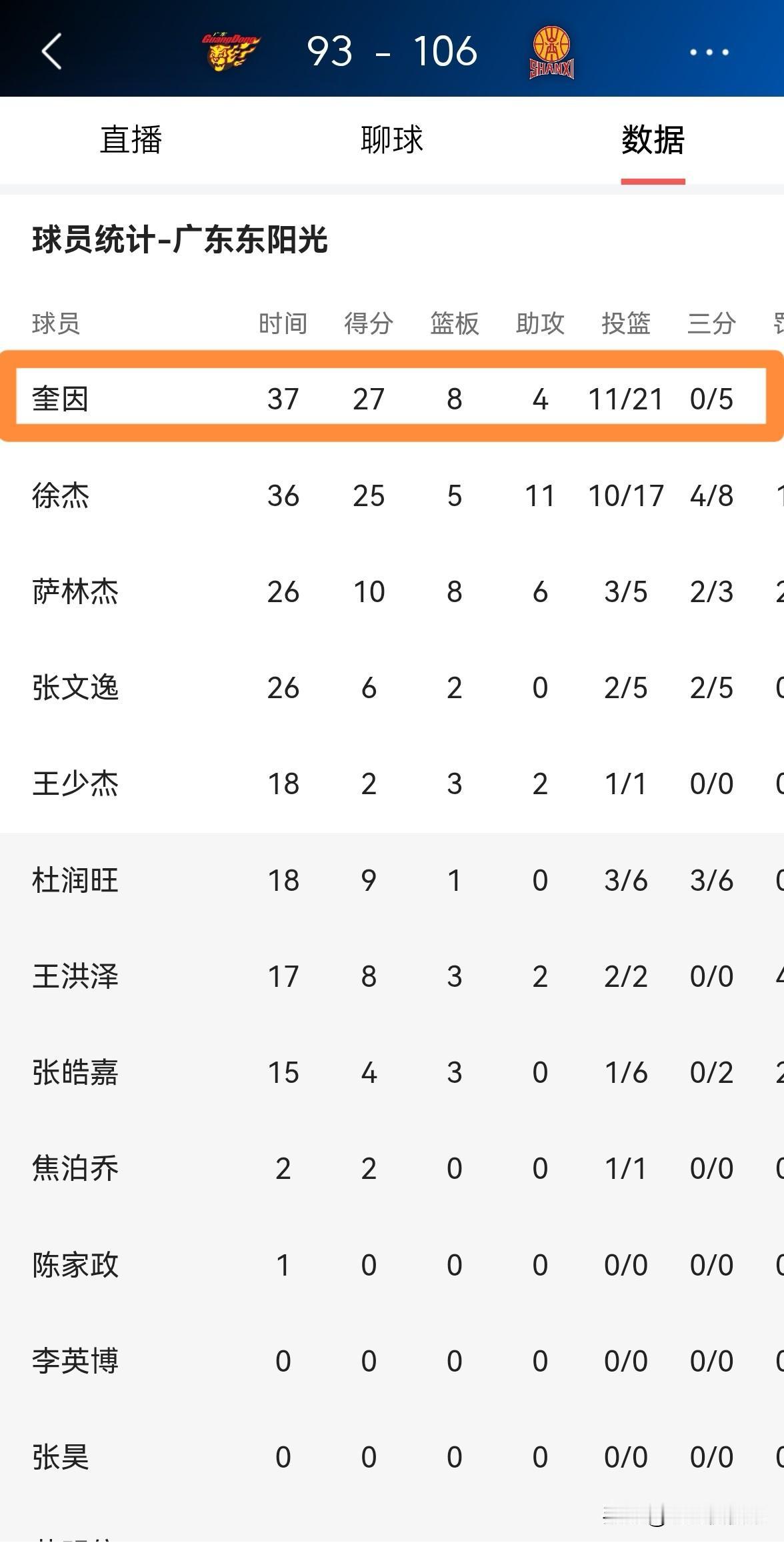 谁能拯救一下广东东阳光大外援奎因的三分球?在今天广东东阳光以93:106不敌山西汾酒的比赛中,奎因在三分线外手感冰凉颗粒无收。 全场比赛下来,奎因首发出战37分钟,投篮21中11,其中三分球5中0、罚球6中5得到27分8篮板4助攻4抢断1盖帽,出现了多达7次的失误。