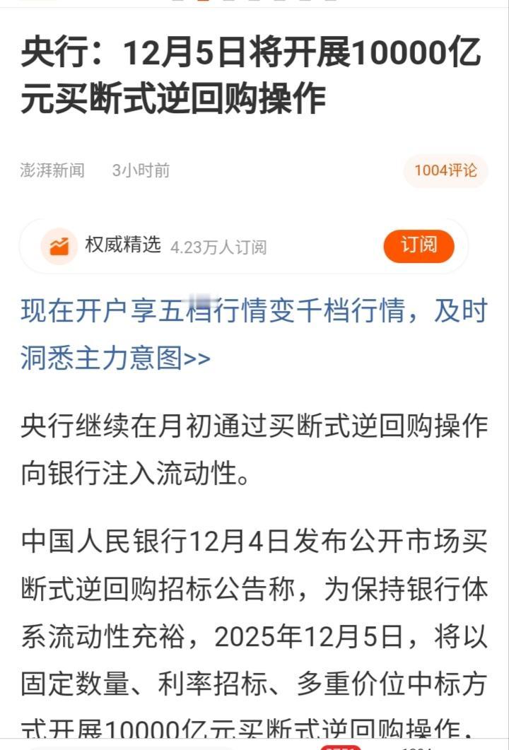 什么情况?11月25日央妈刚派送了一万亿的MLF。 明天(12月5日)又送来了一万亿NHG(买断式逆回购),以保证银行体系流动性充裕。 央妈的呵护真是一场及时雨,为股市的平稳运行增色添彩,保驾护航。
