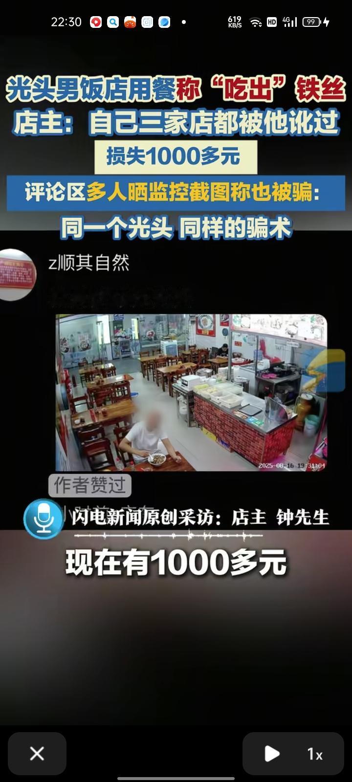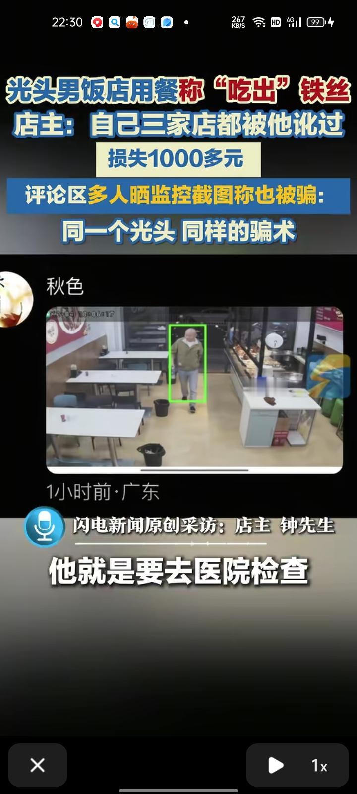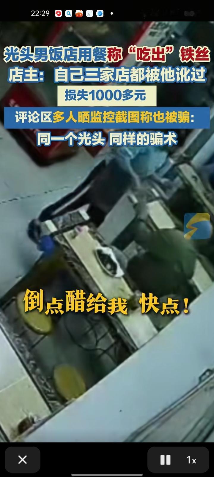12月3日,广东广州。店主晒视频吐槽称,光头男子在饭店用餐称“吃出”铁丝,自己有三个店被他讹了,损失了1000多元。随后,不少网友晒监控截图称也被骗:同一个光头,同样的骗术。