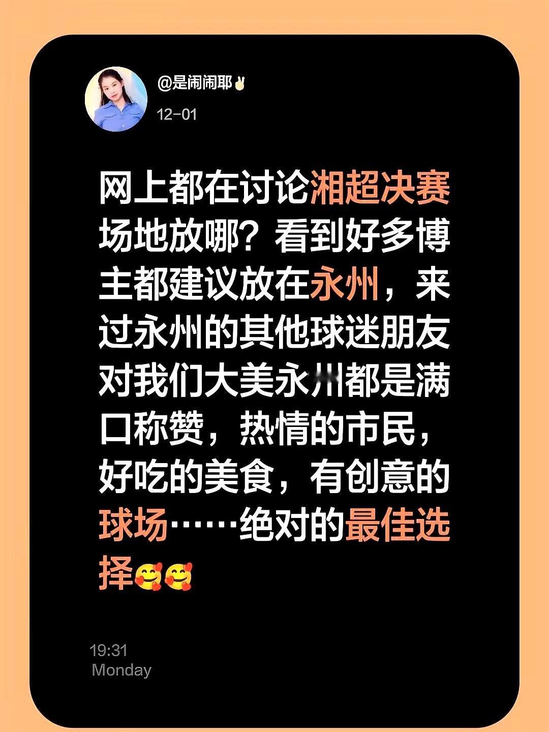 网上都在讨论湘超决赛场地放哪? 讨论中,不少博主都推荐将场地放在永州,提到永州有热情的市民、好吃的美食、有创意的球场,还获得过外地球迷的夸赞。 我觉得永州确实是绝佳选择,这些优势能给参赛队伍和观赛球迷都带来优质体验,湘超决赛的氛围也会因此更浓厚出彩。
