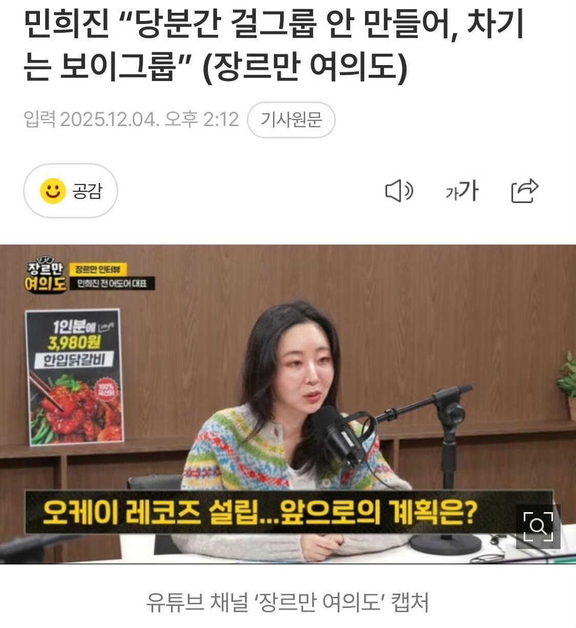 闵熙珍表示:“下一个我要制作女团的事应该不会发生。以后也许会,但短期内没有这个想法。如果要做,那就会做男团。这原本就是我的风格。男团出来之后,再做女团也可以嘛。”