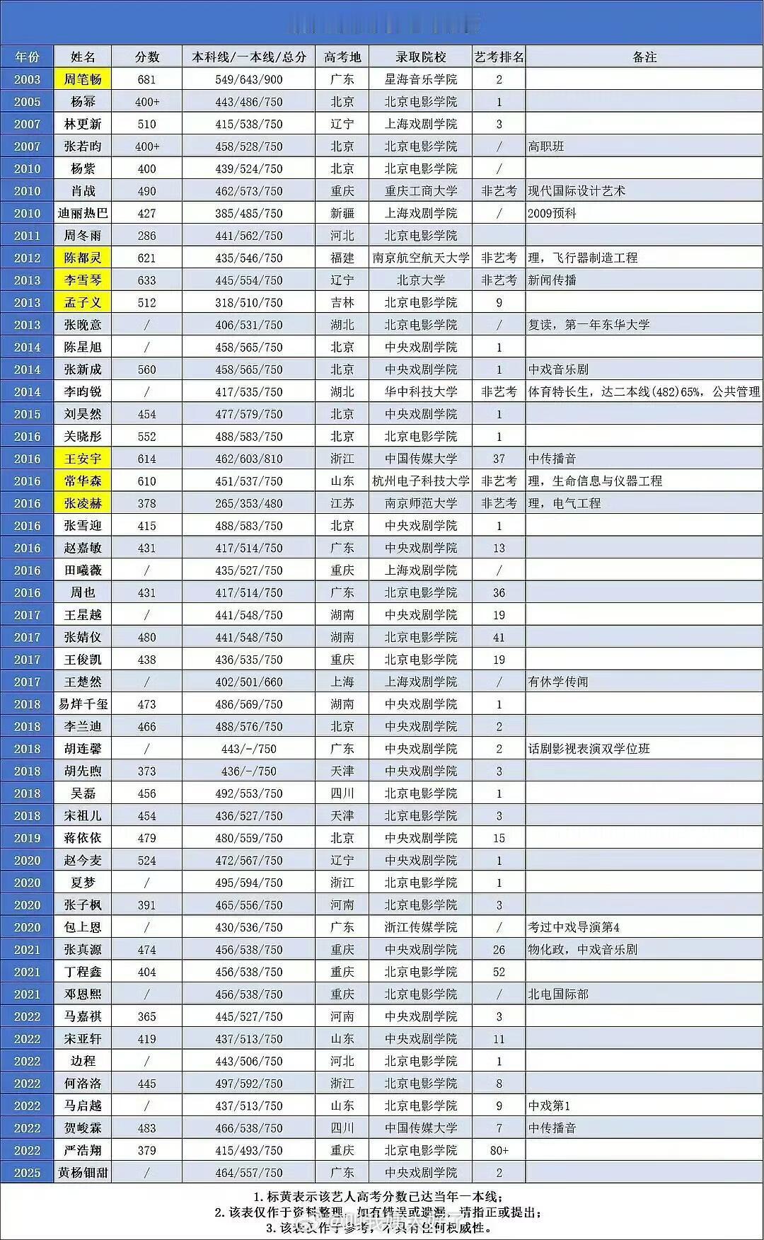 内娱部分艺人高考/艺考成绩拉表感觉有含金量的就李雪琴陈都灵常华森张凌赫