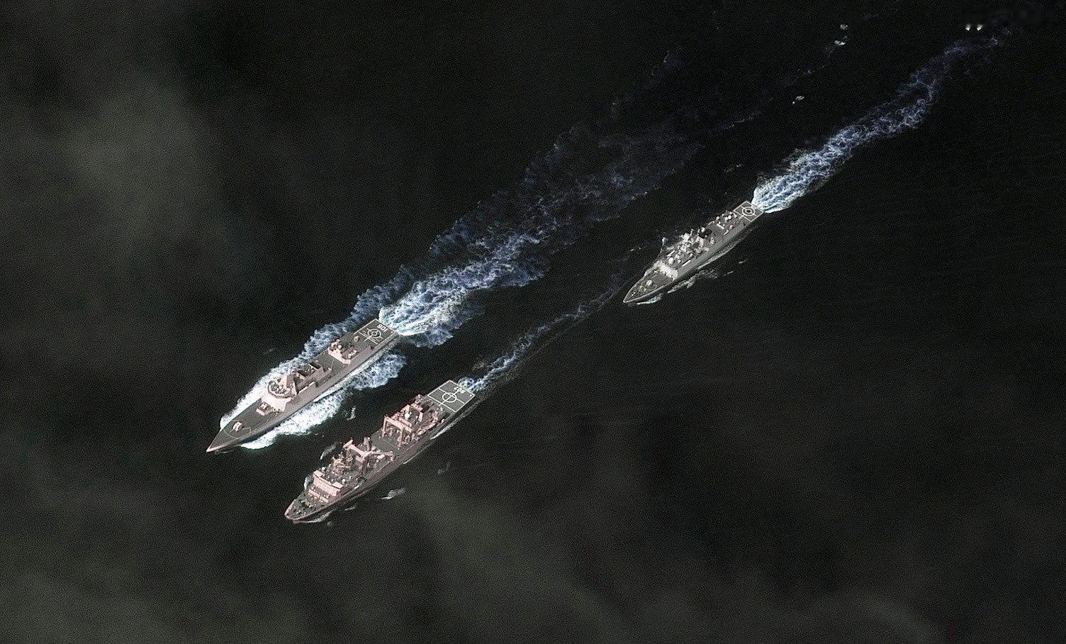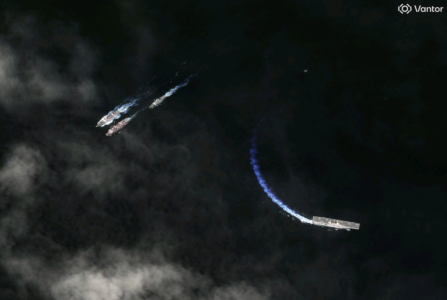 美国地理空间情报公司 Vantor 用高分辨率商业卫星捕捉到的,在菲律宾海活动的中国海军舰艇编队(075两攻舰海南舰、055驱逐舰延安舰、054A护卫舰、903A补给舰骆马湖舰),确实够清晰可以看到,骆马湖舰在为延安舰、054A进行“一横一纵”海上补给,而海南舰已脱离大部队有一段距离编队后续动向,是复刻去年055遵义舰编队“铁矿石回家探亲”环澳?还是绕过菲律宾南部就班师回朝,让土澳虚惊一场?拭目以待 烽火问鼎计划中国海军